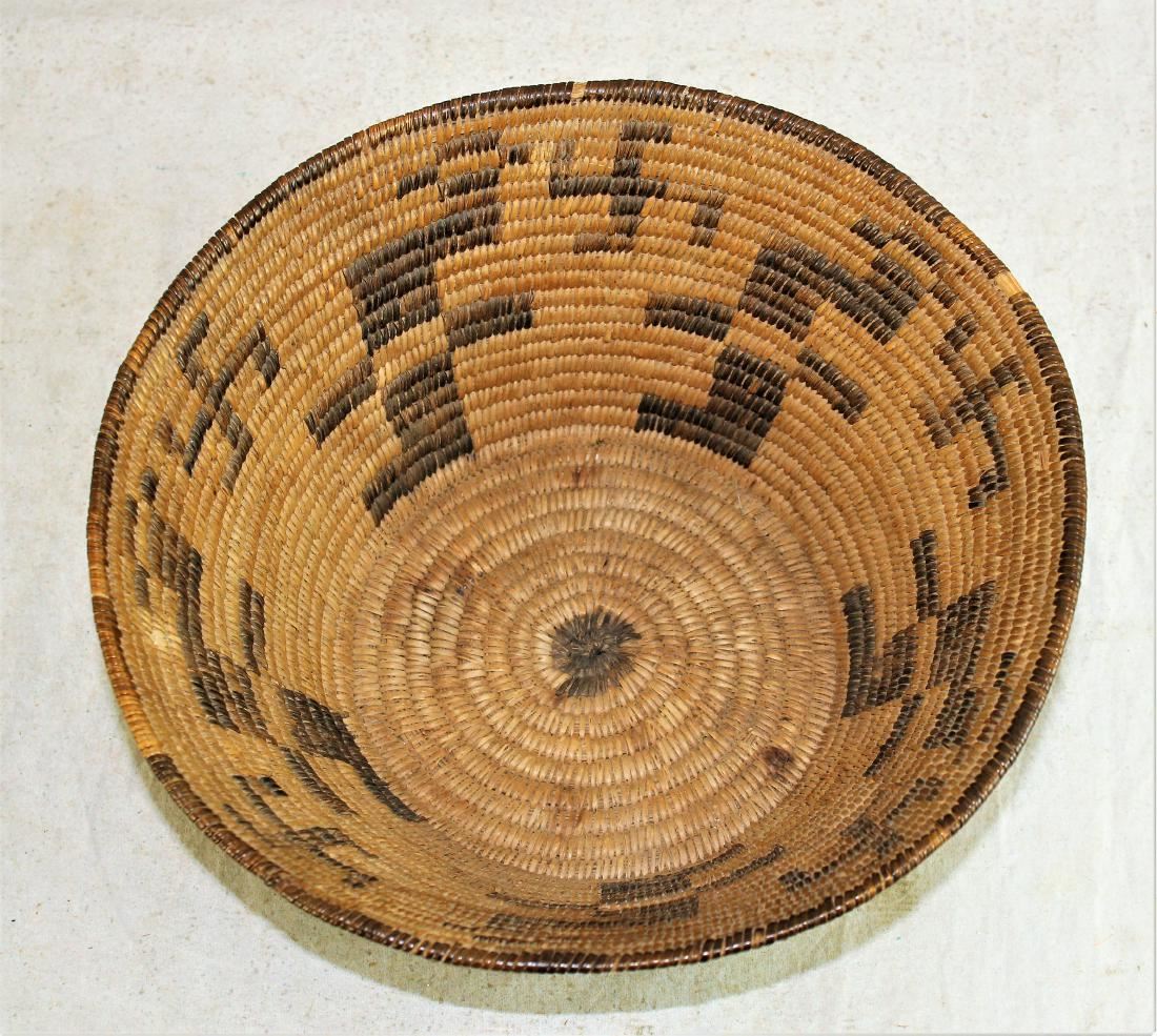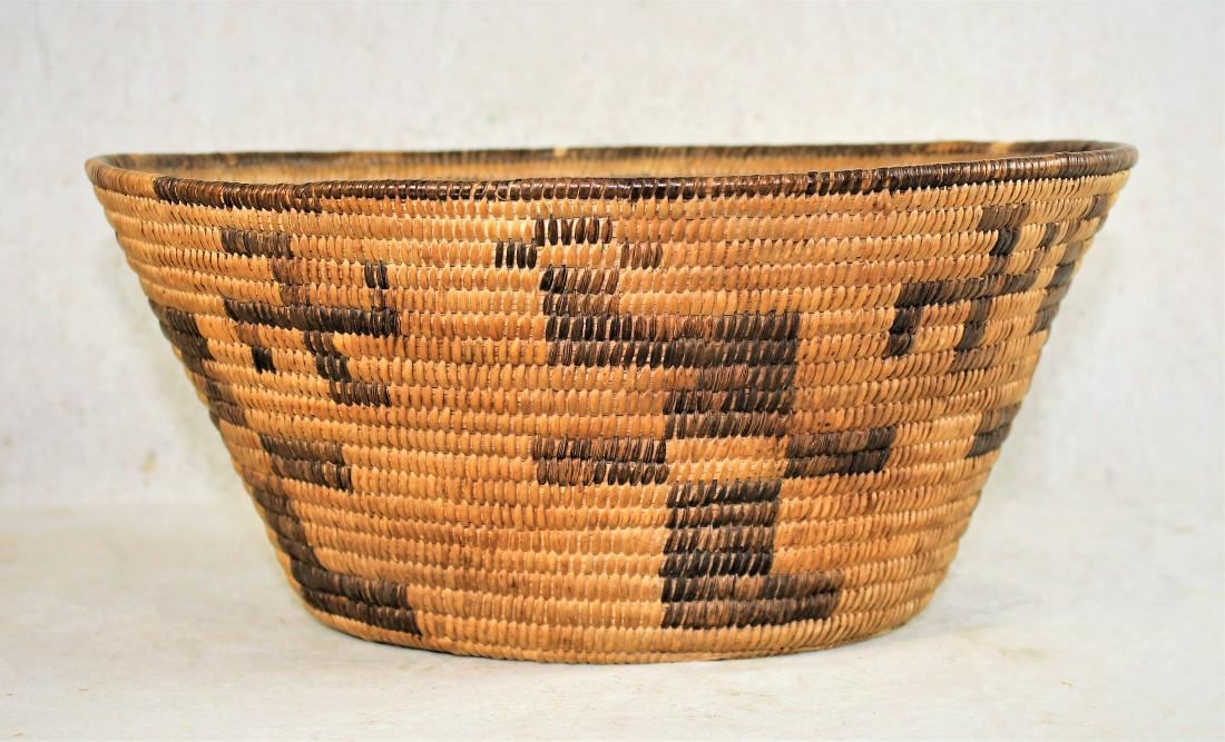 Tightly coiled Native American basket with figural rolling log good luck design with great color and condition.