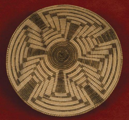 Pima Basket. 3" x 12” tray. Classic 4 petal fretwork design, fine weave. c. 1920s. Excellent condition. (est $2,000-2,500).