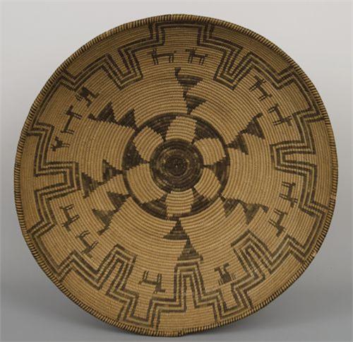 Pima Basket. 1 ½” x 14” tray. Pictorial design 11 animal and human figures. c. 1915-1925. Fine condition. Missing very few rim stitches. (est $3,500-4,500).