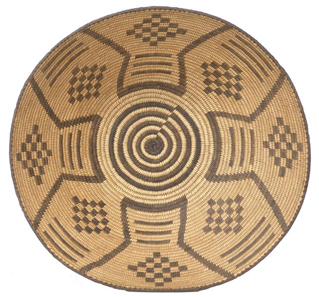 Early 1900s, Large classic basketry bowl with squash blossom and checkered diamond and bar design; excellent condition. 19" dia.
