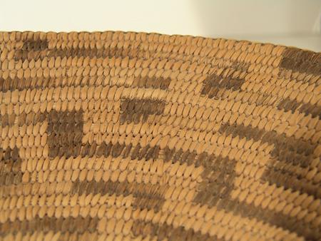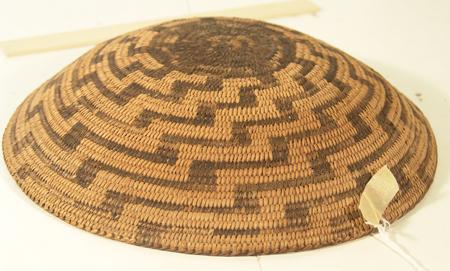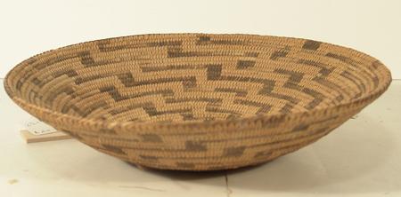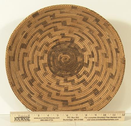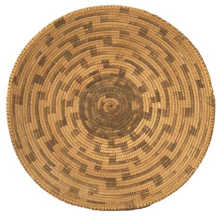 Traditional finer weave basketry plate with black center and radiating stepped design. Condition: very good, some fading. 2-1/2" x 12-1/4"