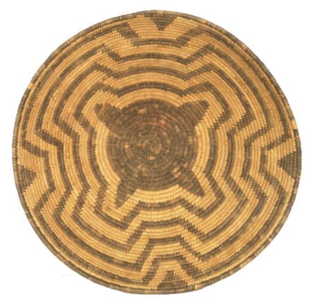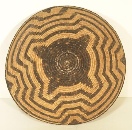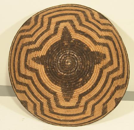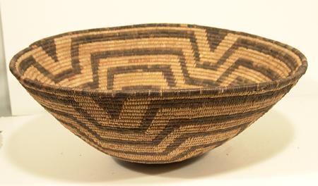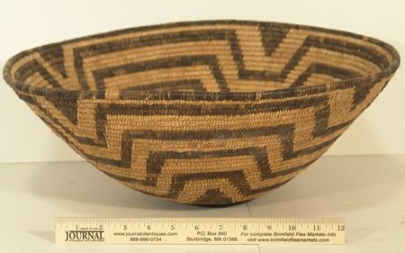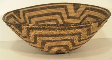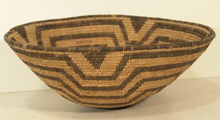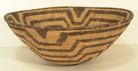 Large classic-shaped basketry bowl with quadrant design done with black devils claw. Purchased from Guidon in 1975 for $150; appraisal value $950. Condition: very good, shows use. 7" high x 18" diameter