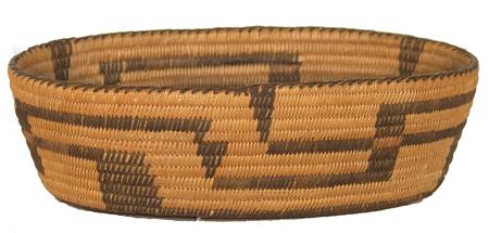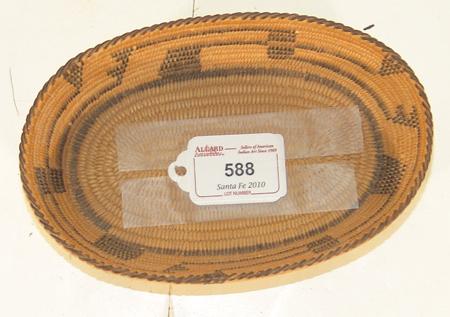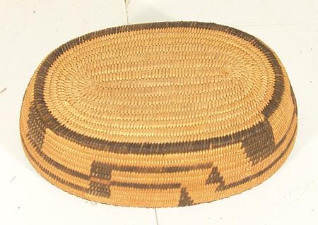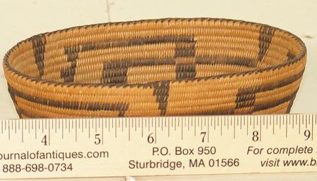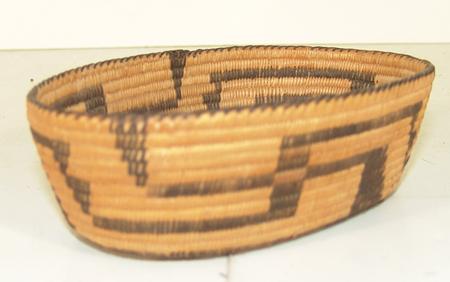 Small oval basket with extra tight weave and fret motif. 2" x 6"