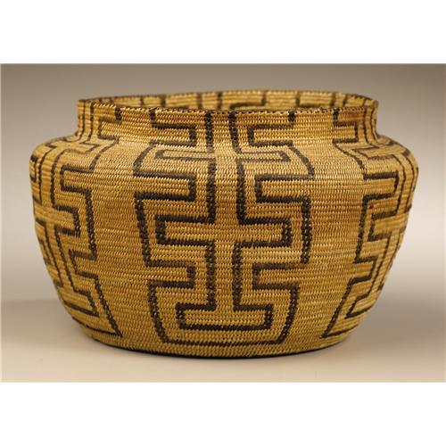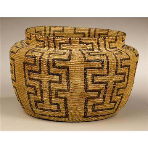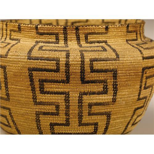 <B>Pima Coiled Bottleneck Basket</B></I><BR>Circa 1900<BR>Height 5 in. Diameter 7 3/4 in.<BR><BR>This finely coiled basket has slightly flaring sides, a high rounded shoulder, and a straight neck flaring at the rim. The basket is decorated with a series of vertical meander lines that mirror each other. The weaver would have to keep the design in her head and any miscalculation would upset the symmetry of the pattern.<BR><BR>Provenance<BR>McCloud Collection.<BR>Hudson Trading Co., Oracle Arizona<BR><BR> <BR><BR><B>Important notice:<