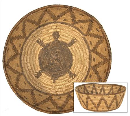 Deep basket with turtle in bottom and zig-zag and dot motif. 3-3/4" x 9-1/2"
