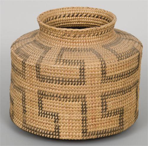 Pima Maricopa Basket. 8 ½” x 7". Olla Shape. Open fretwork design and narrow mouth. Fine condition. (est $500-600)