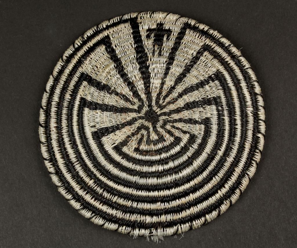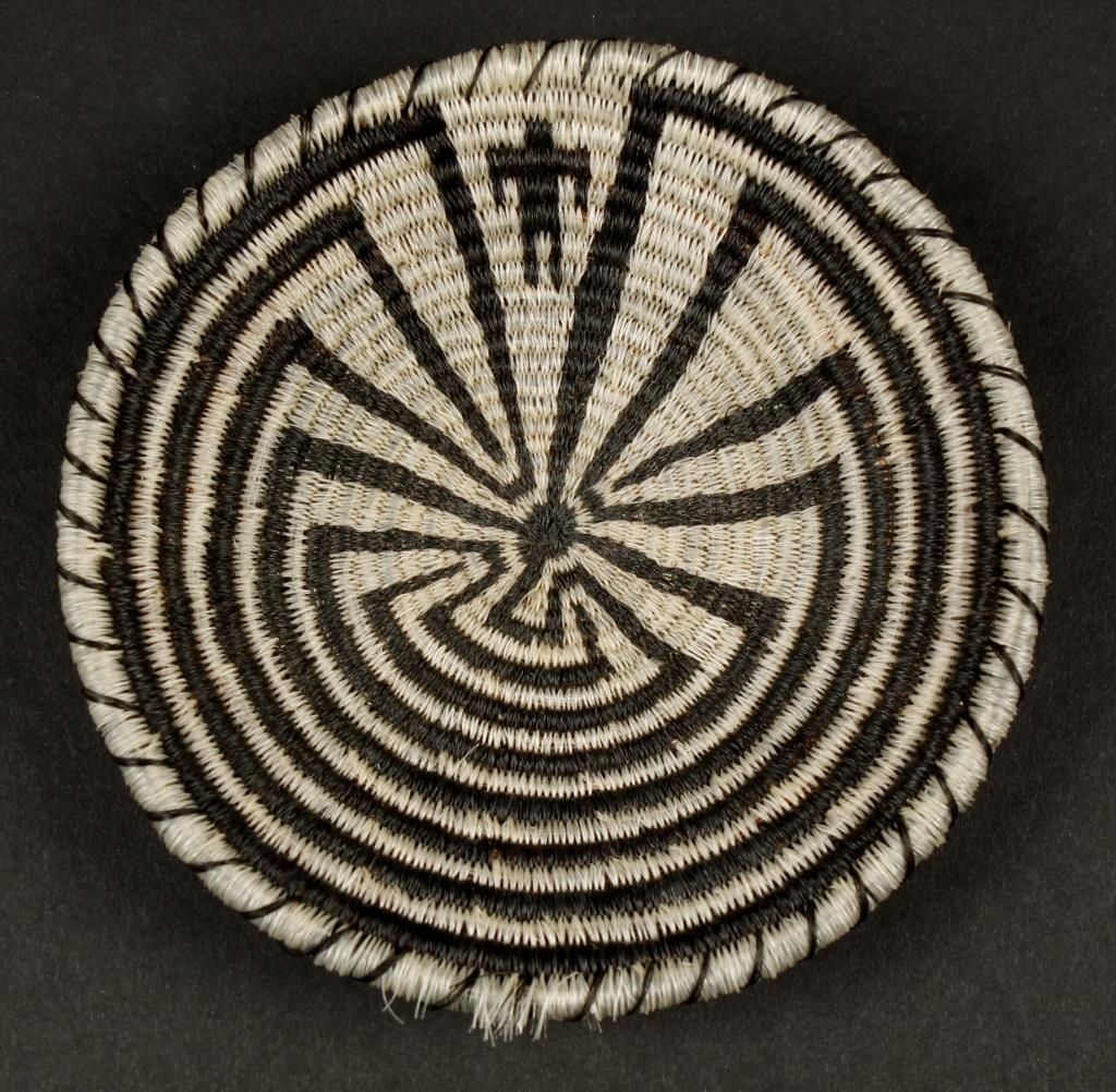 Horsehair basket, black and white. Very tightly woven. 4-3/8" diameter. Slight losses to edge, otherwise good.