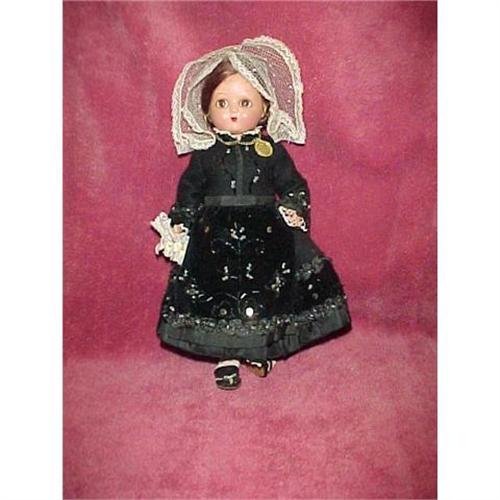 10". Marked PIMAR on the back. Appears to be hard plastic. eyes open & shut. Original clothing, good condition