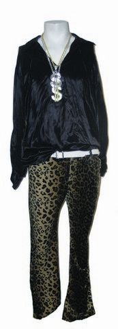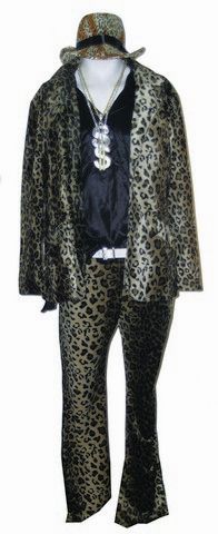 Made by New York costume designer Frankie Stein, this is a custom made pimp costume. Comes complete with faux leapord jacket and pants, a flowing black shirt, chains, belt and hat. Ms. Stein's work has been featured on stage, television, film & print, and she successfully owns and operates "Frankie Steinz" costume shop in New York. As a freelance costume designer, she later moved her business to New York City where her many clients include ABC, Sony, Disney and HBO, and celebrities Robert De Niro, Billy Joel and Dolly Parton, to name a few. Her work has been featured in The New York Times, Time Out magazine and People Online, and has been seen on The David Letterman Show, The View, Saturday Night Live, The Rosie O'Donnell Show, and Everybody Loves Raymond, and she is credited on the major Academy Award winning film 'Eternal Sunshine of the Spotless Mind.'
