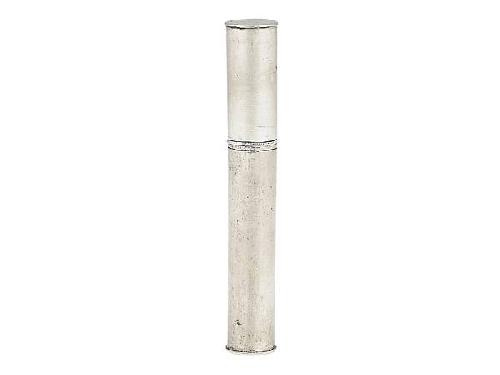 Silver, 18 g. Longish cylindrical form, detachable cap. Marked: 13 lat (26 ounces) fineness and S. W. maker’s mark. Újbánya (?), mid 19th century. v.ö. Koszeghy: 2131. Length: 8 cm
