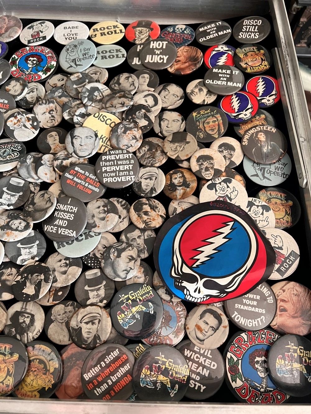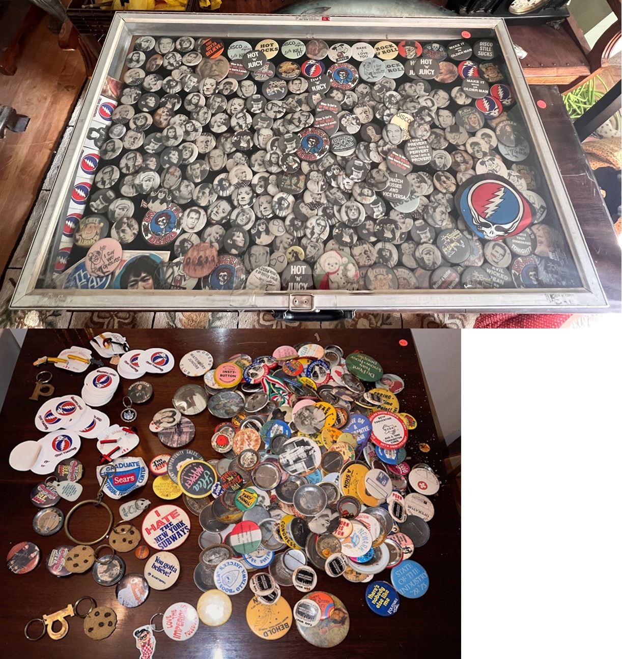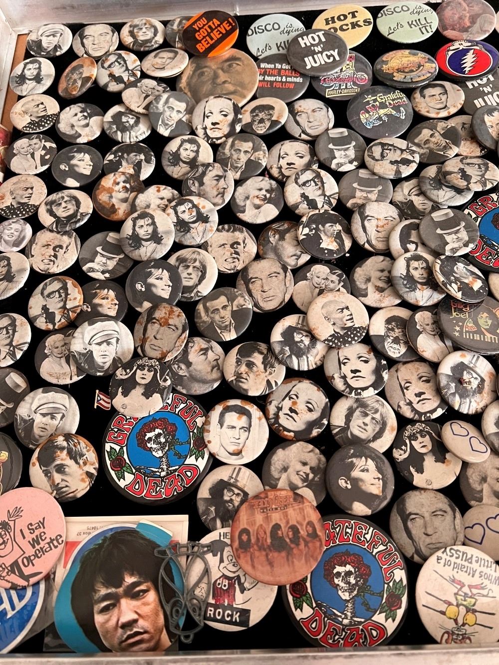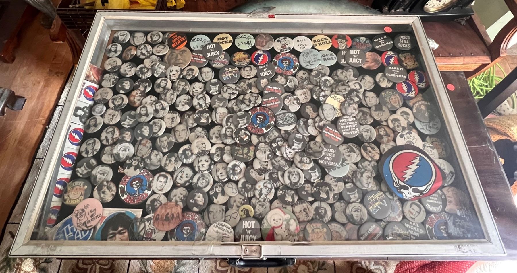 Rock n' Roll, Hollywood Stars, assorted pins in a glass casing and a box filled with an assortment of pins. Case measures approx. 34 inches wide x 22 inches deep (not included).