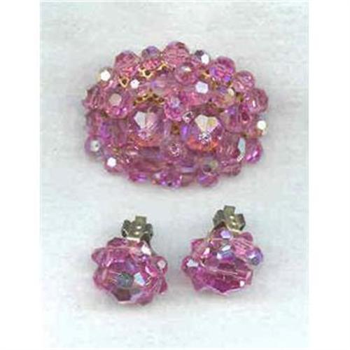 This set is "Caged" in other words the pink crystal beads are wired onto their bases. The pin is 2" X 1.1/2". The earings are 7/8" X 7/8". They are clips. The earings have not been cleaned.