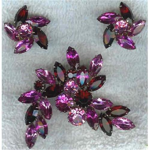 Pin is 2.3/4" X 2.3/4" Earings are 1" X 1" Ruby red color and dark pink stones set in a white metal setting (rhodium?) Circa 1950?