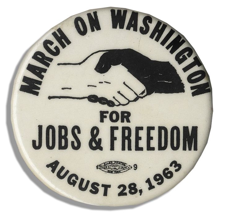 ''March On Washington For Jobs and Freedom'' button. Pin bears the black and white handshake icon and the words, ''March on Washington / For / Jobs & Freedom / August 28, 1963''. At the bottom edge is the Printers Union logo. Measures 2.25'' in diameter. A near fine touchstone from the pinnacle of the Civil Rights Movement.