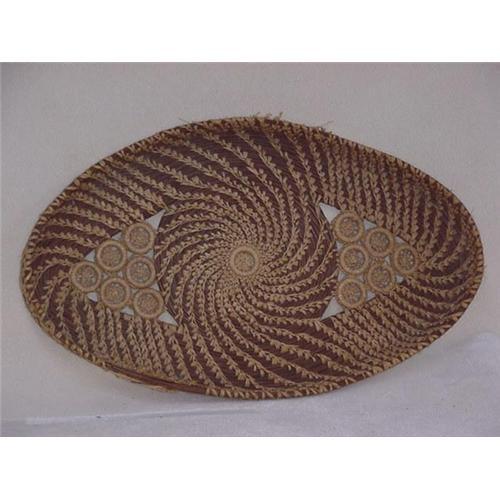 A Pine needle tray basket, 15" long, 9 1/2" wide. A beautifully designed and handmade basket of pine needles and straw. Some damage to outer rim.