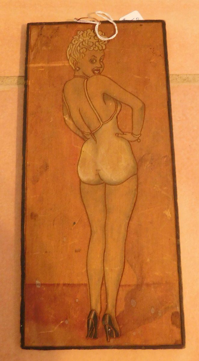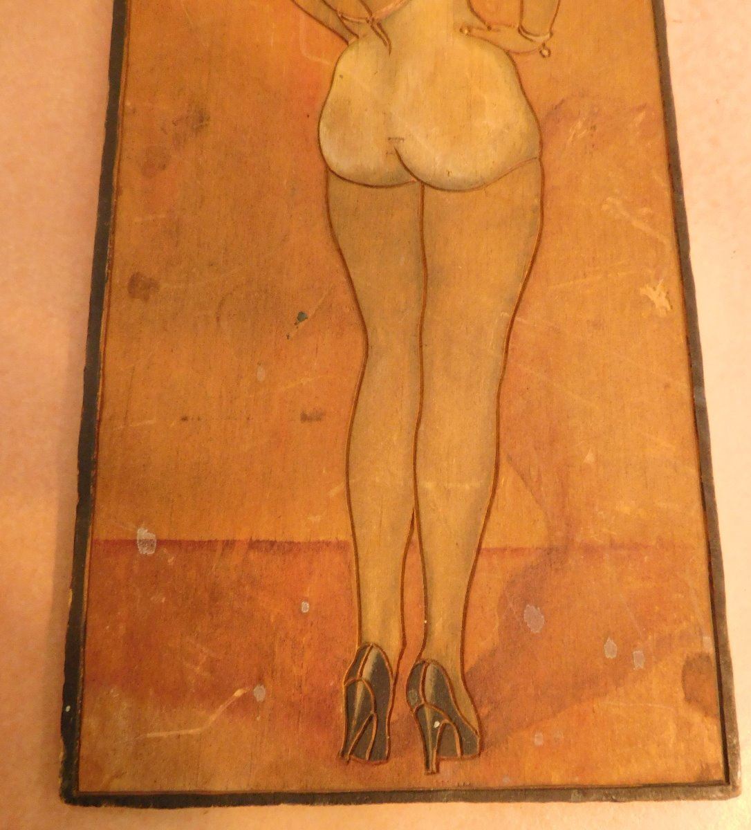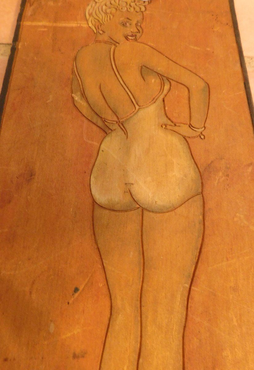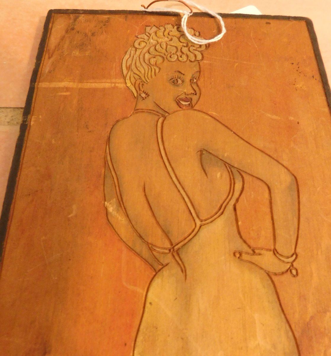 Pin-Up Model Wood Engraving, circa WWII. Made of wood and paint, the item is 11.5" x 5.5" x 0.25". Gretta Garbo. Condition: Some stains, fair, see images. Shipping: $20.00 w/insurance and signature.