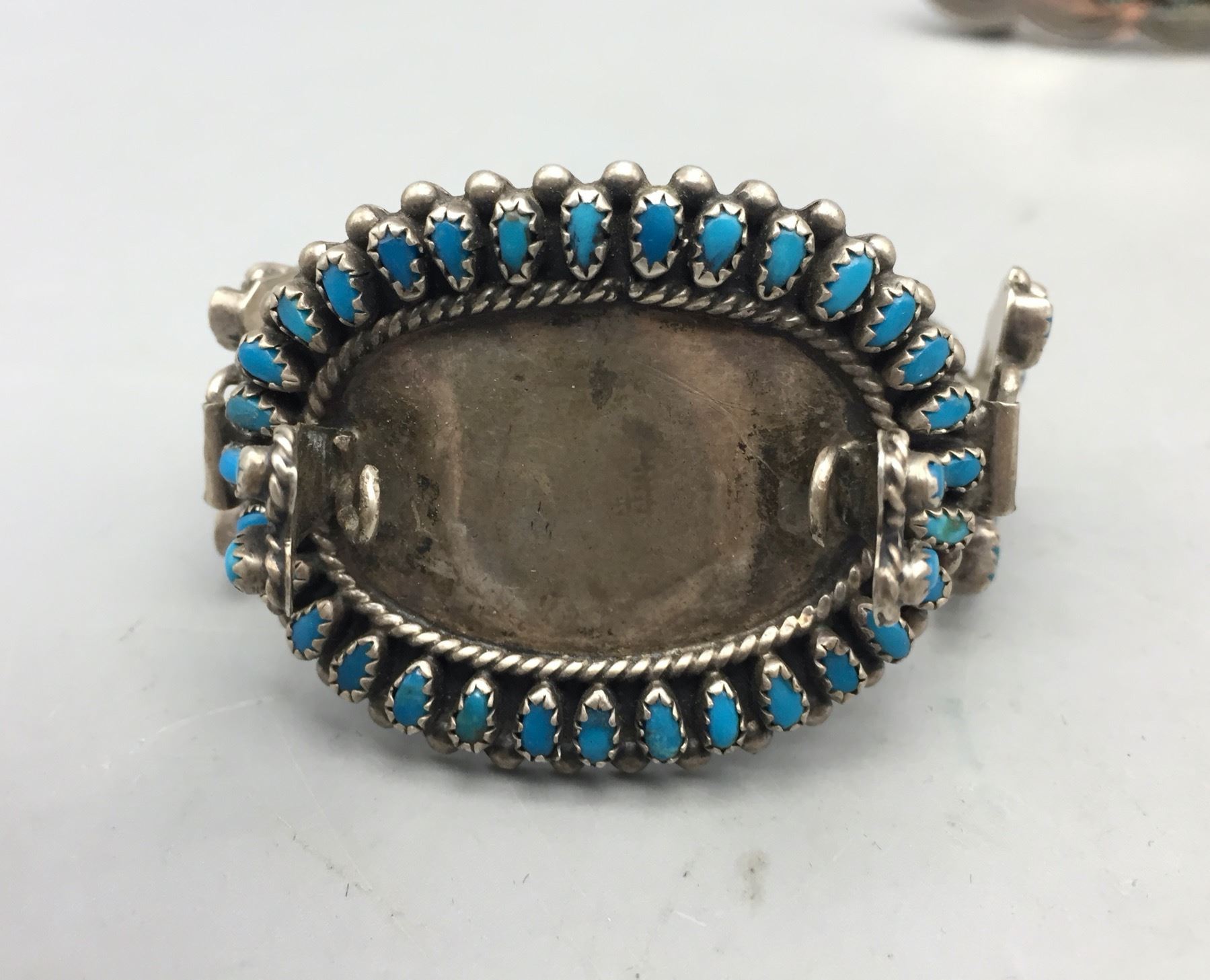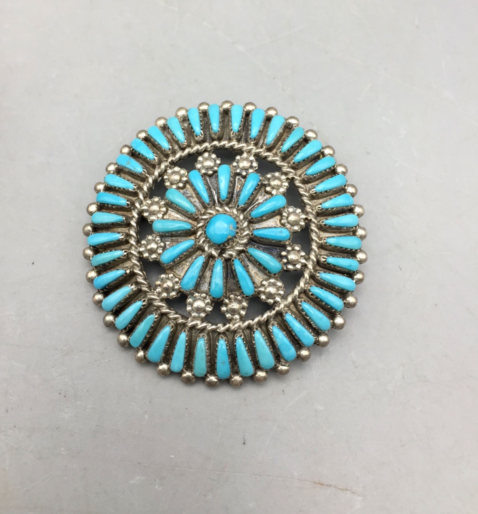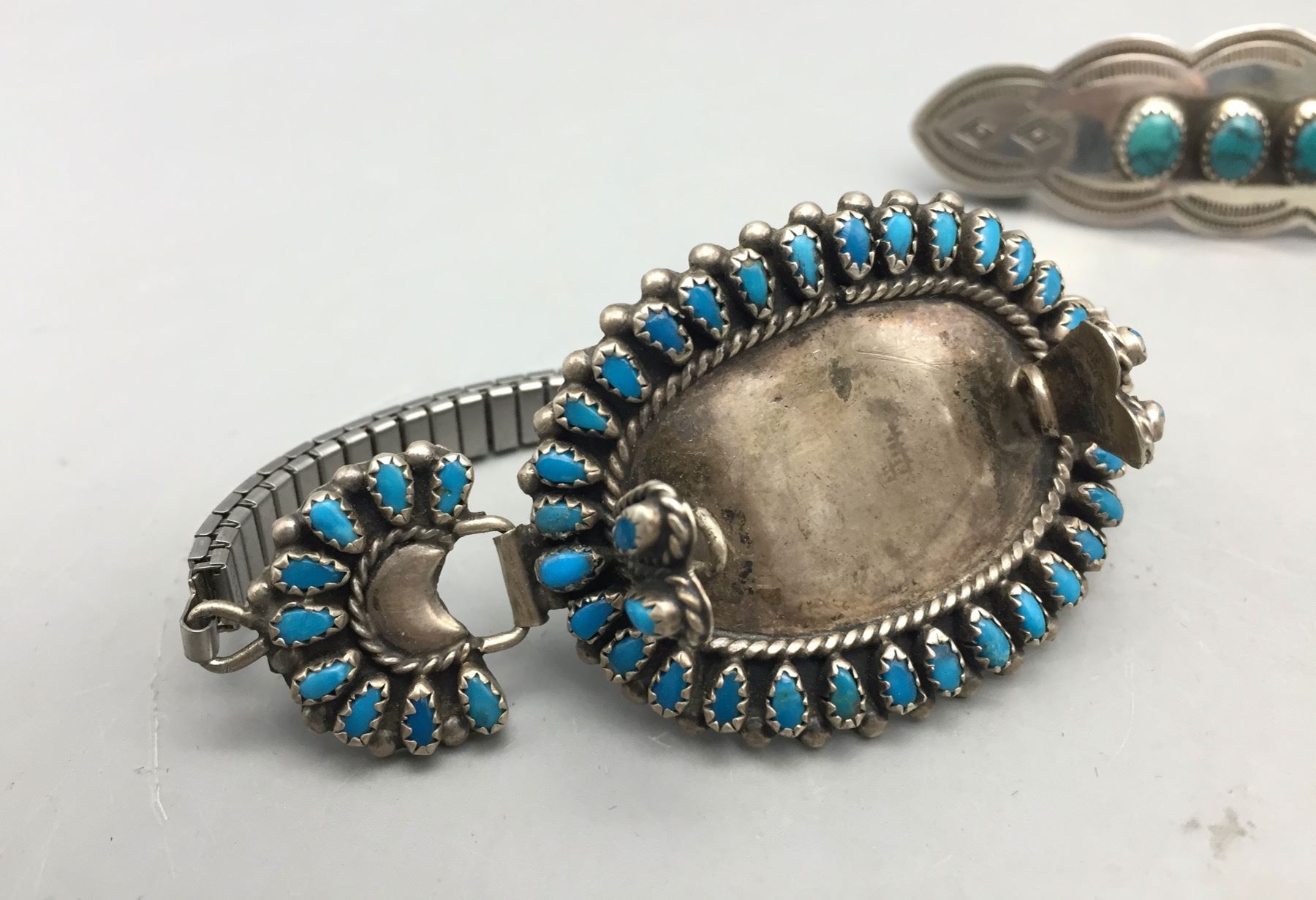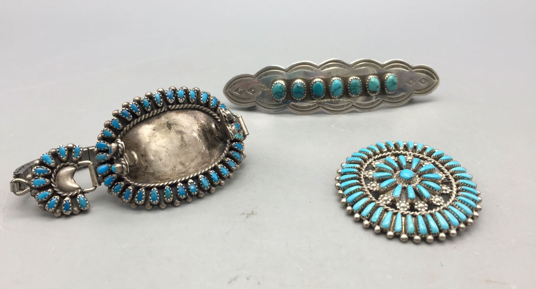 Description: For sale in this lot we have three beautiful pieces of jewelry. A cluster pin, a hair barrette, and turquoise cluster watch band. All are set with turquoise in sterling silver. Maker: Various. Approx. Age: Vintage. Size: Various. Combined weight is 69 grams. Condition: Good for its age, normal wear expected. Please look closely at the pictures - they are an important part of our description. Shipping: There will be a $5 handling / packaging fee for shipping this lot. The actual cost of postage will be added on top of that.