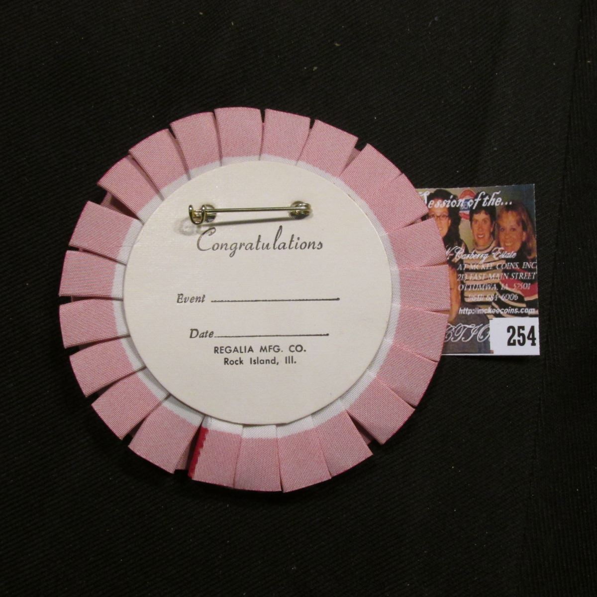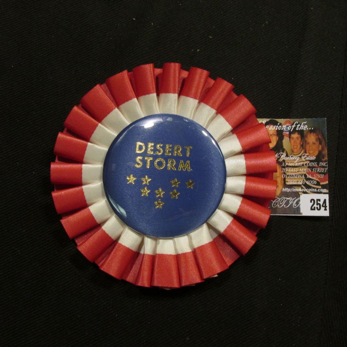Pin-back "Congratulations Event_____ Date _____ Regalia Mfg. Co., Rock Island, Ill.", "Desert Storm" red, white, and blue with celluloid pin surrounded by ribbon.