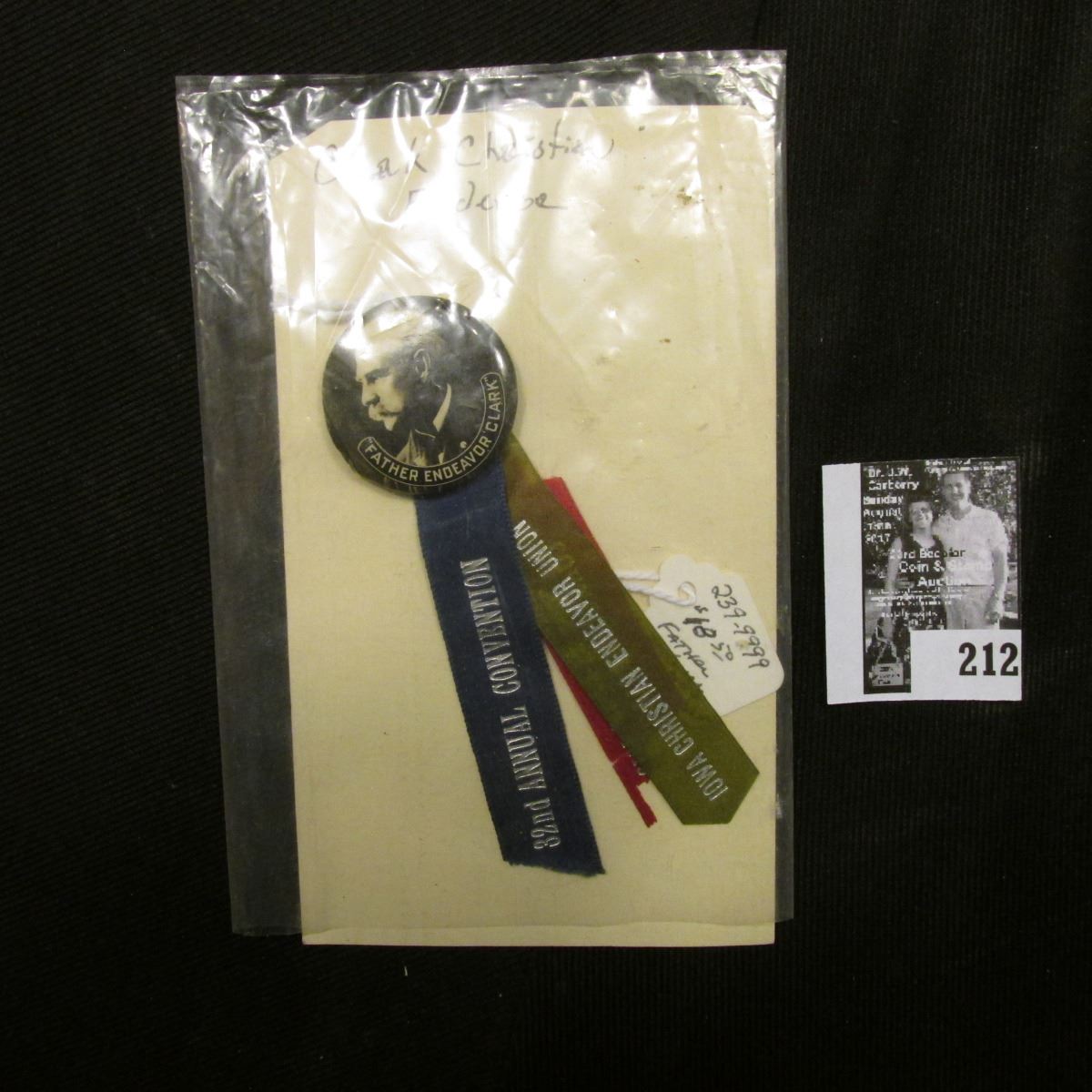 Pin-back with ribbon "Father Endeavor Clark 32nd Annual Convention Iowa Christian Endeavor Union"; & a large group of Christian Endeavor Ribbons & Flags.