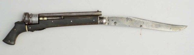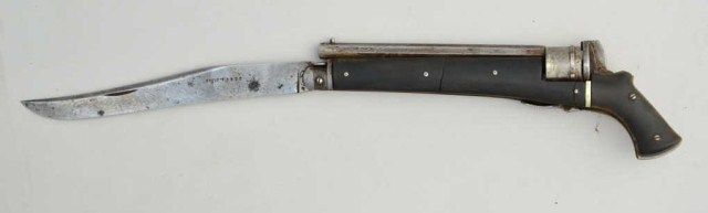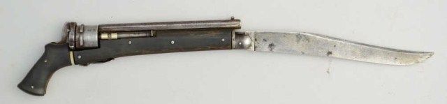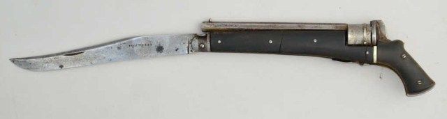 Pin fire knife pistol of unusually large size for small caliber revolver and blade marked “Brevete S. G. D. G.” and showing makers stamp “SB”. The cylinder shows Belgium proofs and the grip scales are made of horn. The pistol measures nearly 14-1/2” overall with blade extended and barrel measures 5” and is 22 rim fire caliber. The blade is approx 6-1/2”. The grip scales are good other than one crack on left side. The metal surfaces show some light to moderate pitting. The revolver is DA, 6 shot and is revolving but out of time and the ejector rod is retained. Circa 1870-1890’s. Last sold Richard K. Bourne catalogue of the JamesElwood Jones collection 1981. From an old New York collector’s estate. Est.;$1,000-$2,000.
