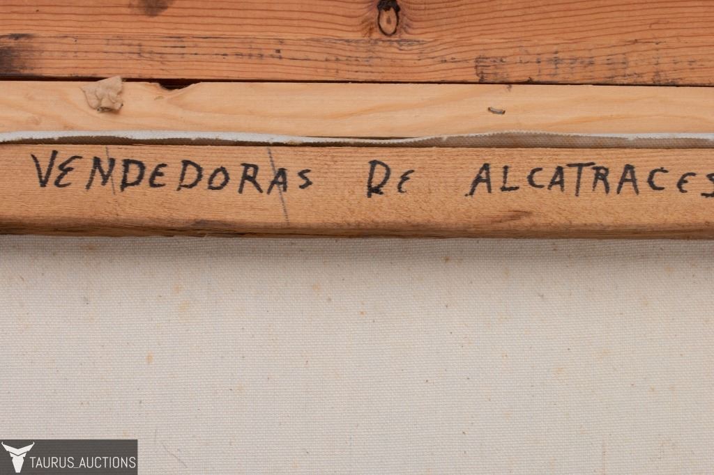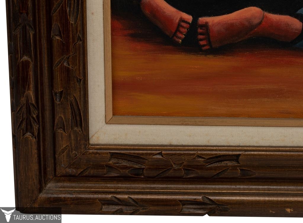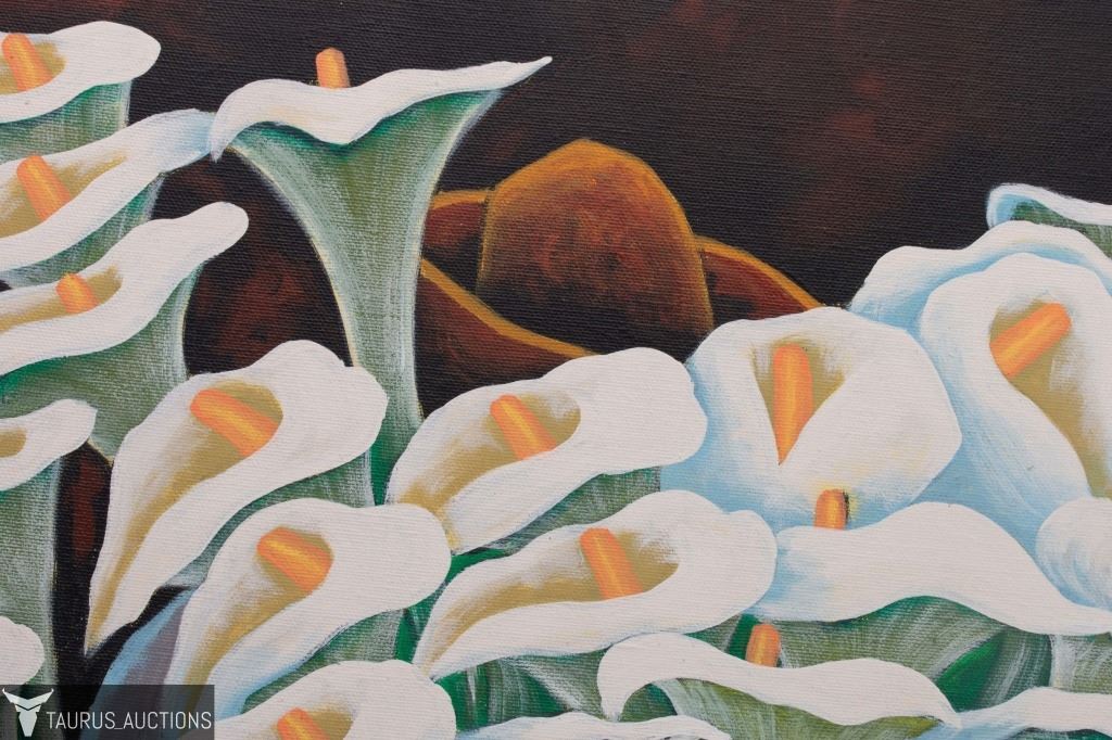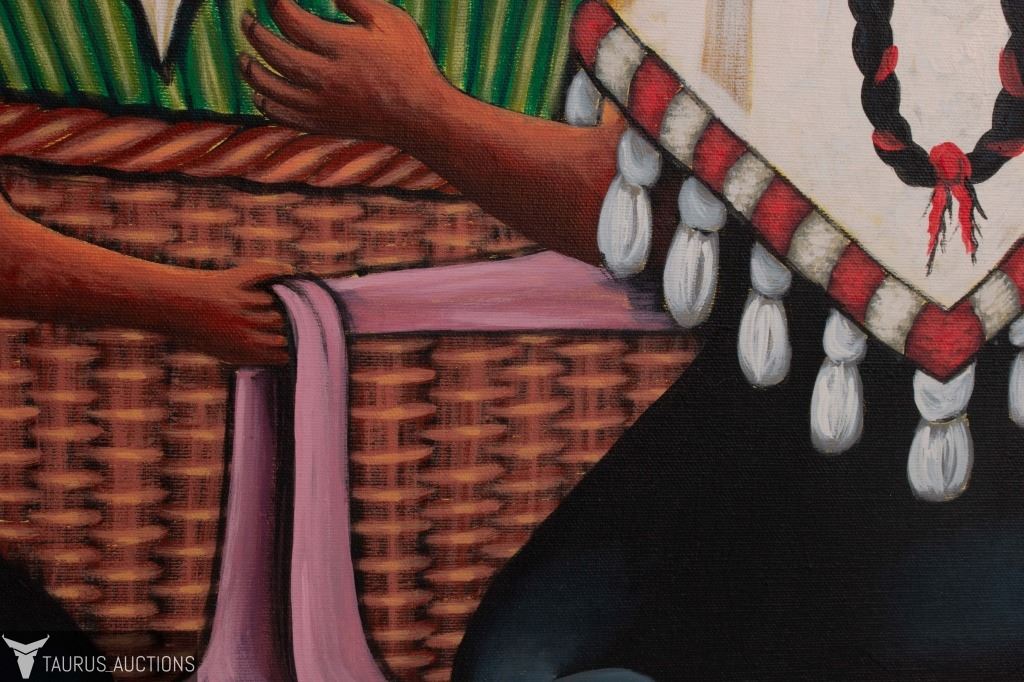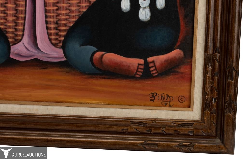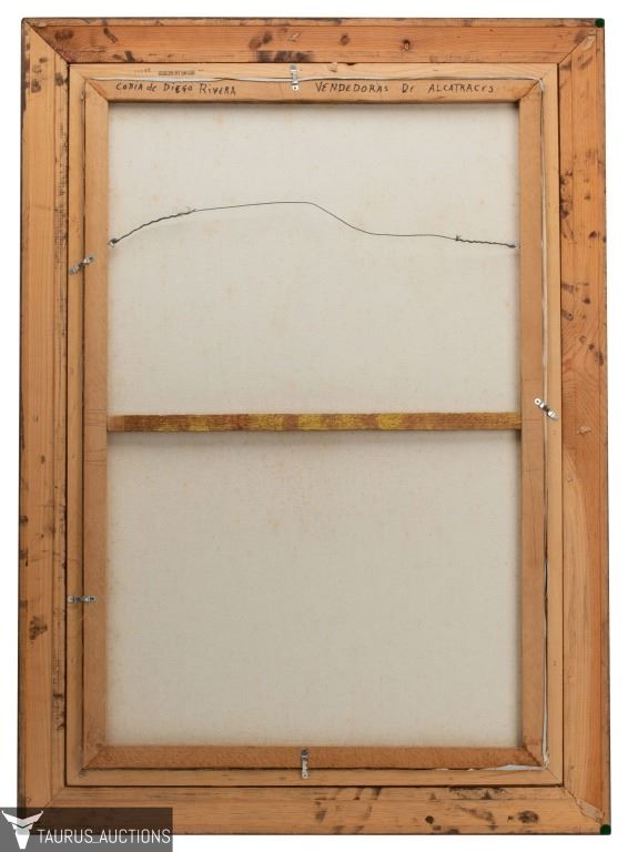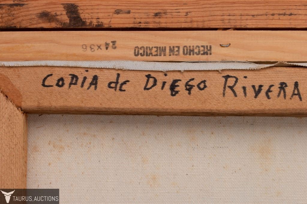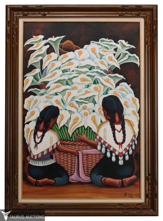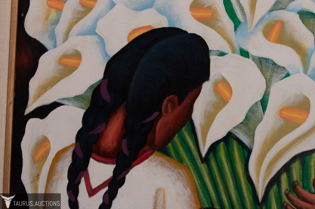 Item/Description: Framed painting depicting two young girls with a large bouquet of calla lilies. Signed lower right: Pina. After Diego Rivera's Vendoras de Alcatraces (Calla Lily Vendors) originally created in 1943. In murals, canvas paintings and watercolors throughout his career, Diego Rivera represented the everyday lives of the indigenous peoples of Mexico. Among his most iconic subjects were calla lily vendors.