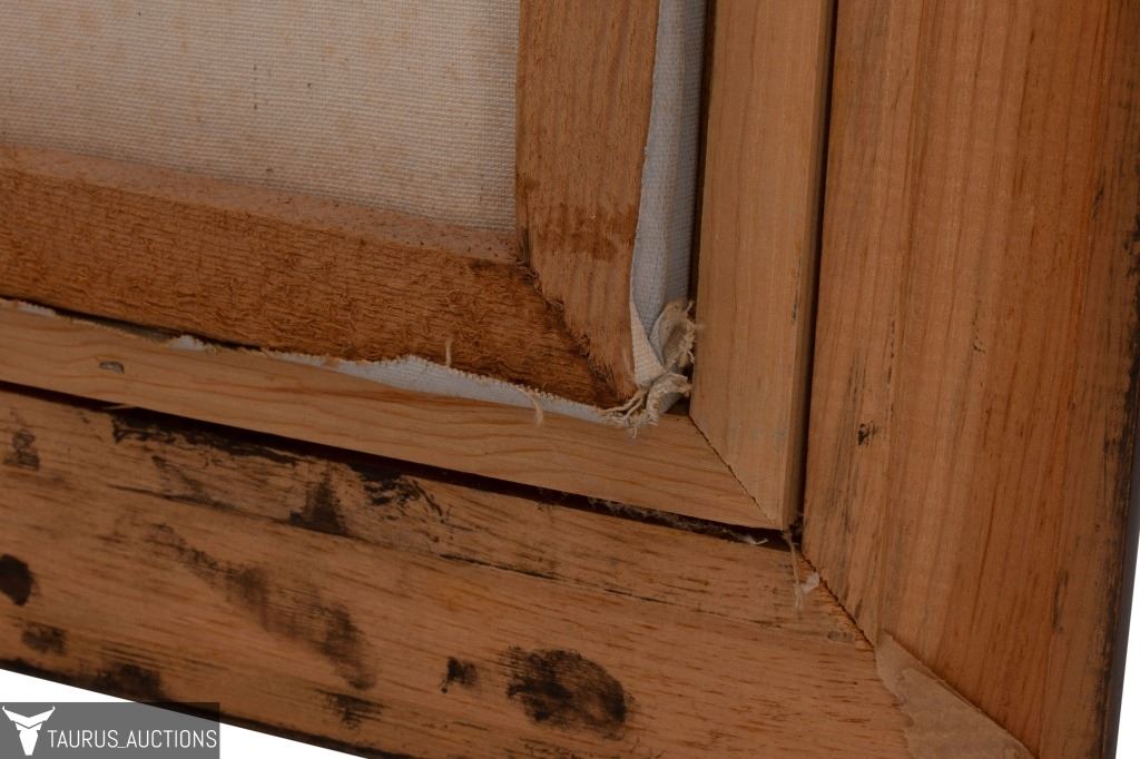 Condition: Signs of age and wear include framing nail trough canvas, surface scratches, scuffs, smudges and chipping to frame.