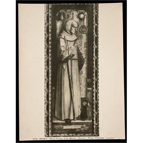 Old black and white Pinacoteca Vaticana photograph of a portrait of Beato Jacopo della Marca, taken from a painting by Crivelli. It is stamped on the back with a partly legible seal that reads "Gallerie Ponti..." This photo came from a trunk of old photographs and postcards from European museums collected during a European tour in the late 1920's. In good condition as shown.