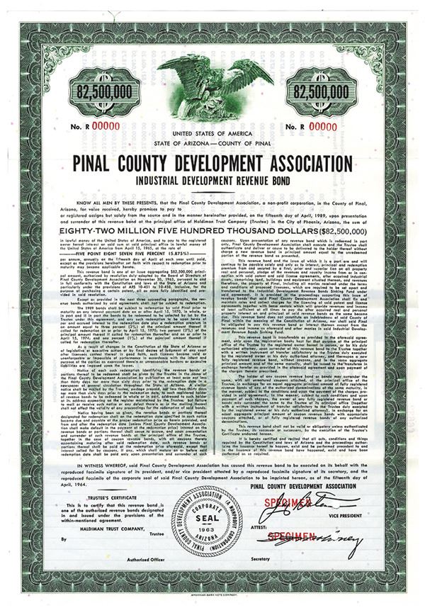 Pinal County, Arizona. $82,500,000 Specimen 5.875% Industrial Development Revenue Bond, Black print on green border and under tint, Bald Eagle at top, Specimen overprints and POC's, VF-XF condition, ABNC. Extremely rare bond with this high denomination.