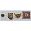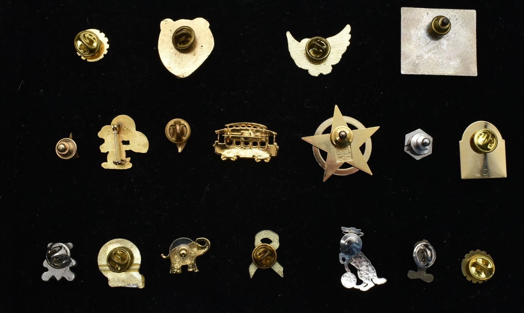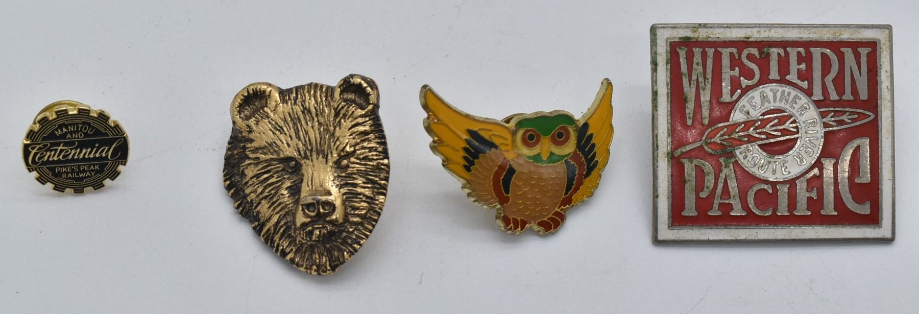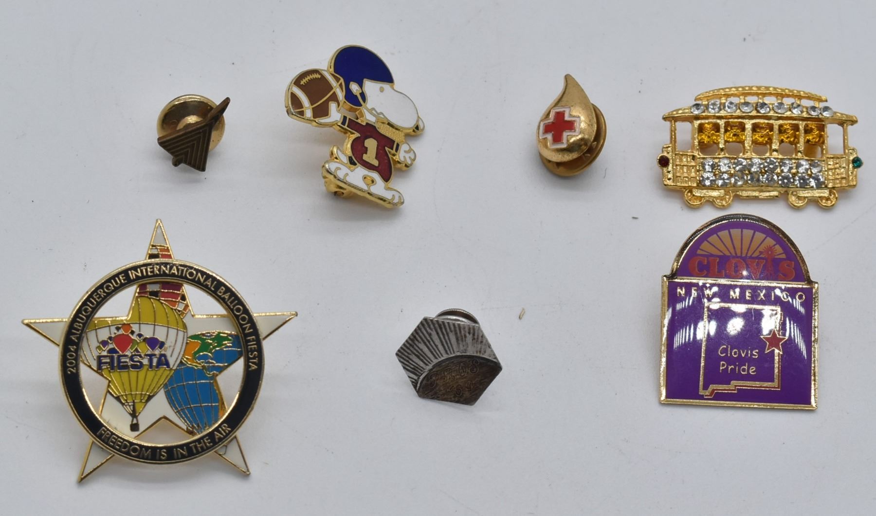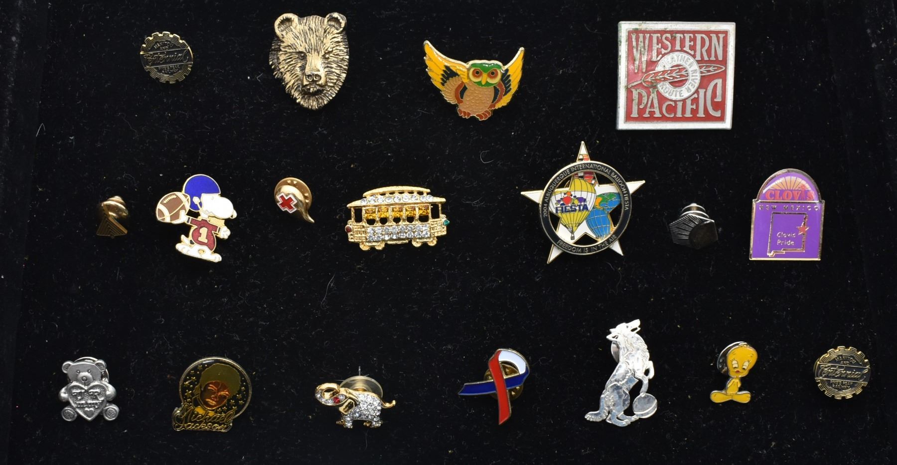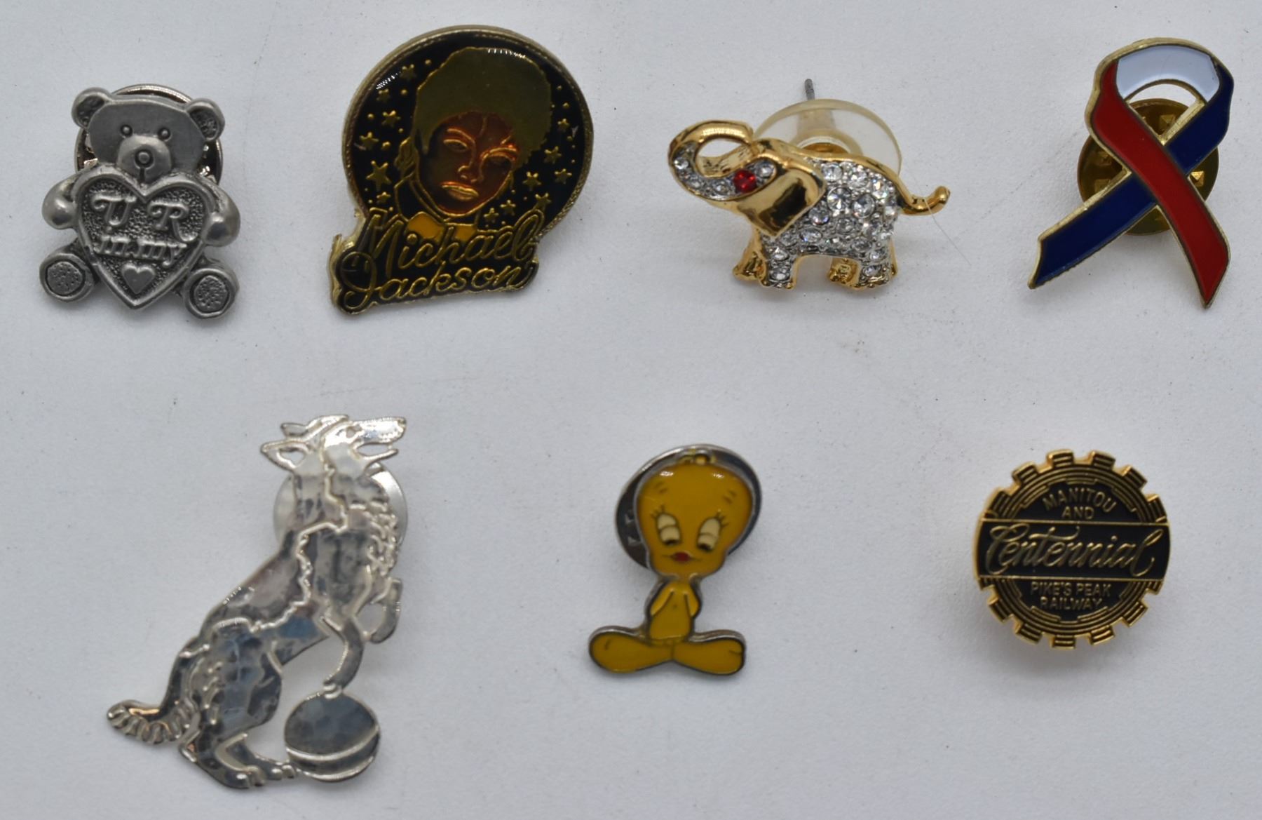 Pinback Assortment, 18 Pins, Michael Jackson, Snoopy Plus!, assortment composed of: Michael Jackson, Rhinestone Elephant, Balloon Fiesta 2004, Tweetie, Football Snoopy, Western Pacific Feather River Route, Grizzly Bear, Red Cross Blood Drive, Peak Railway Centennial pins, Teddy Bear, etc., all pins are complete with pinch-backs in vintage condition