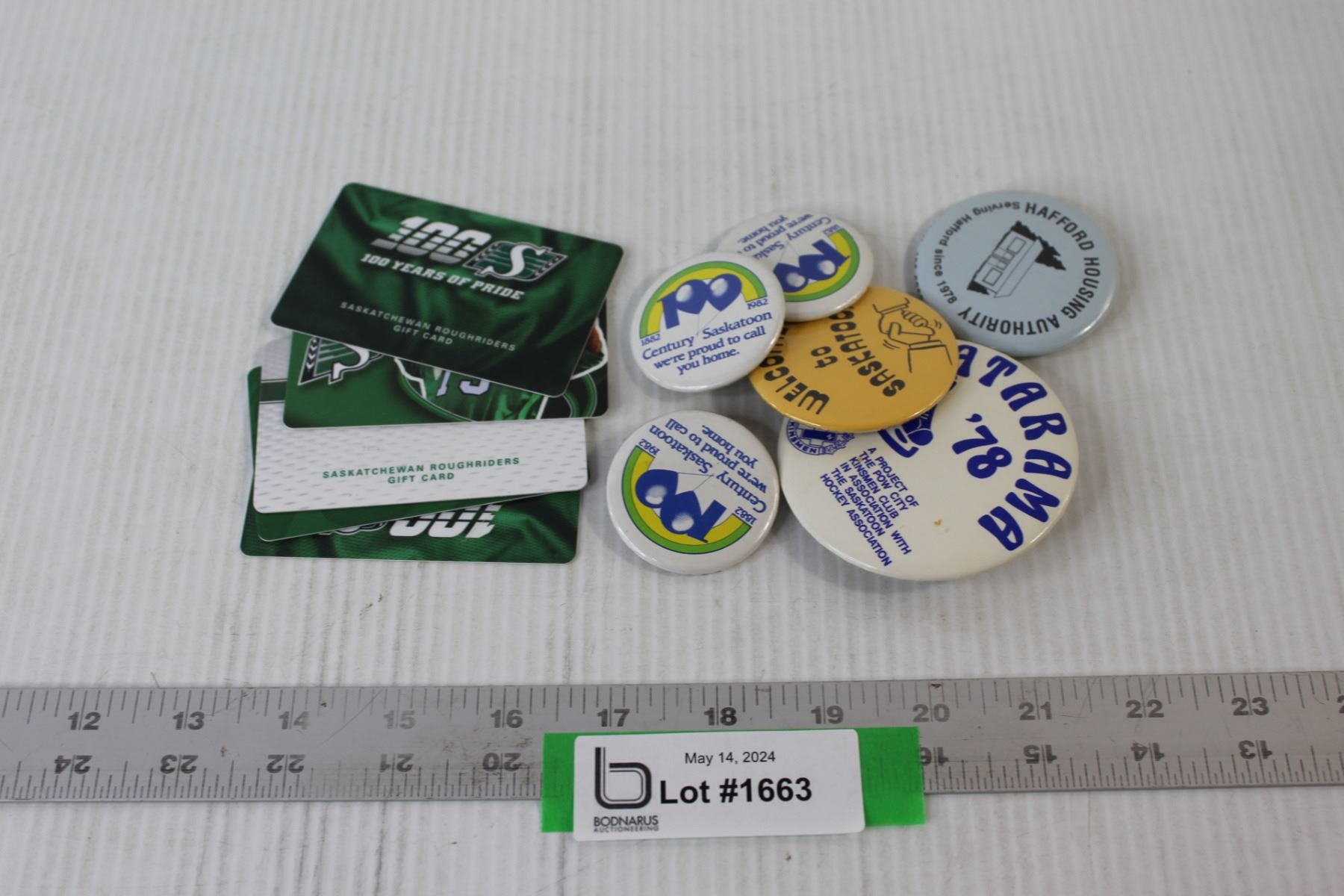 Pinbacks & Saskatchewan Roughrider Gift Cards