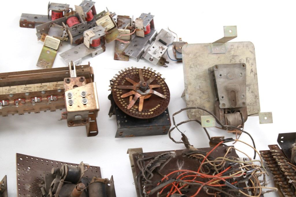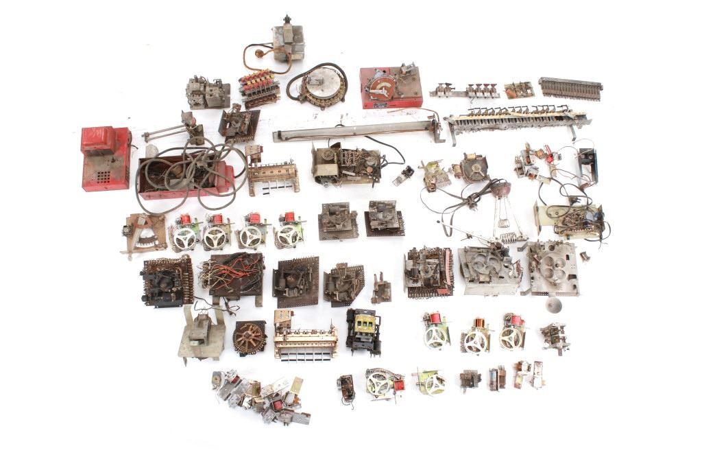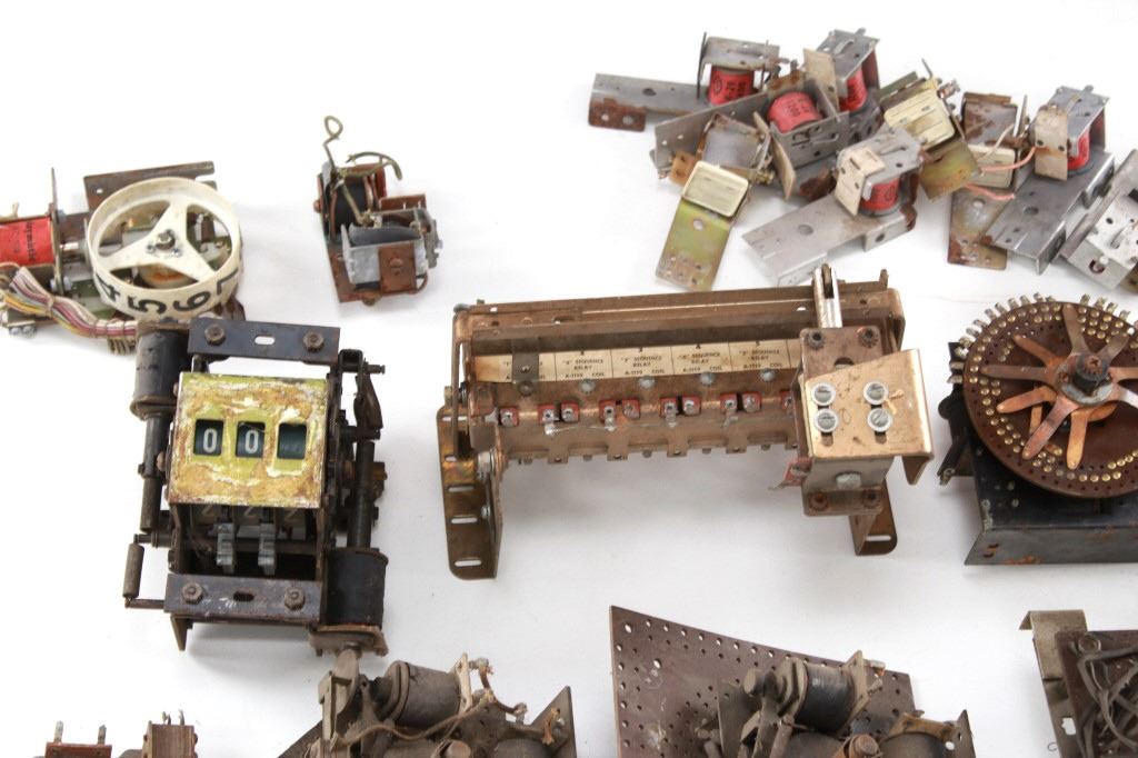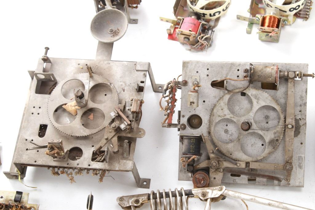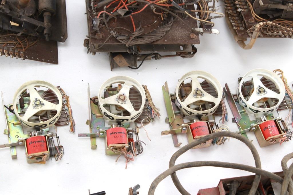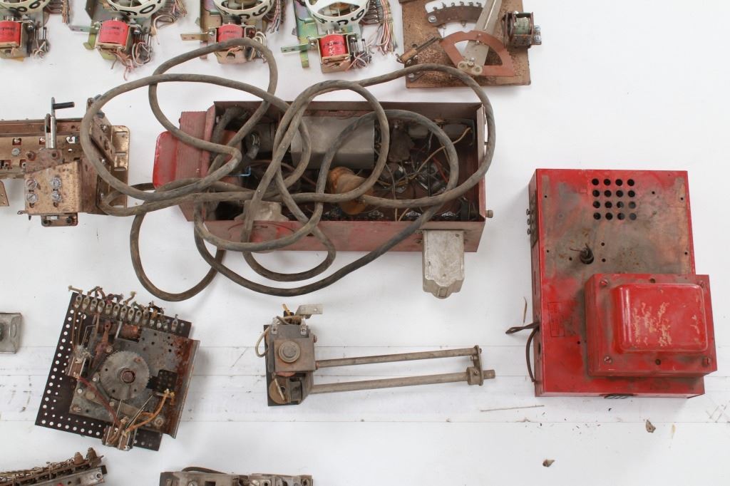 Featured in this lot is a large collection of over 150 used pinball machine parts from 1950-80s. Some of the machine parts include: Playmatic score reel coils with original score reels, Chicago Coin relay coils, Gottlieb relay coils, fuses, Chicago Coin scoring relay coils, Win relay shuffle switches, score motor unit, light sockets, circuit boards and much more. The parts come from various manufacturers of pinball machines such as: Chicago Coin, Gottlieb, Playmatic, Stern and Williams. Some parts come complete and some are missing components and/or relay coils. The largest part measures 24 1/2" L x 3 3/4" W x 6" H, while some of the smallest measure 1 1/8" L x 1" W x 1 1/4" H.
