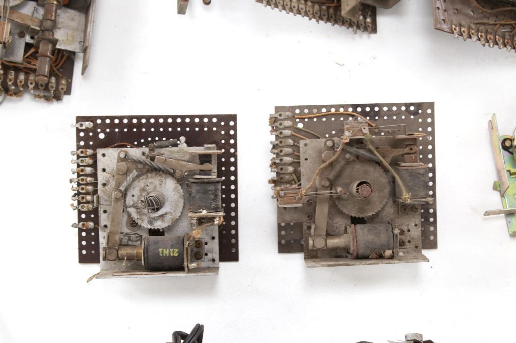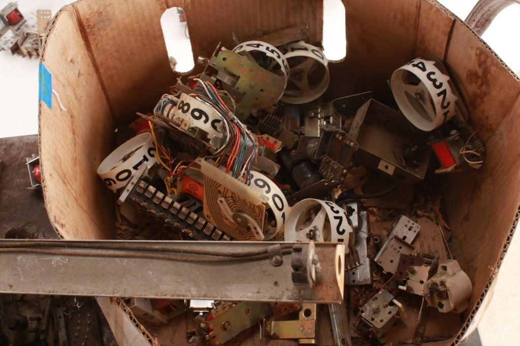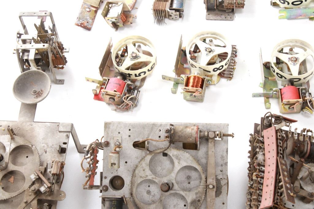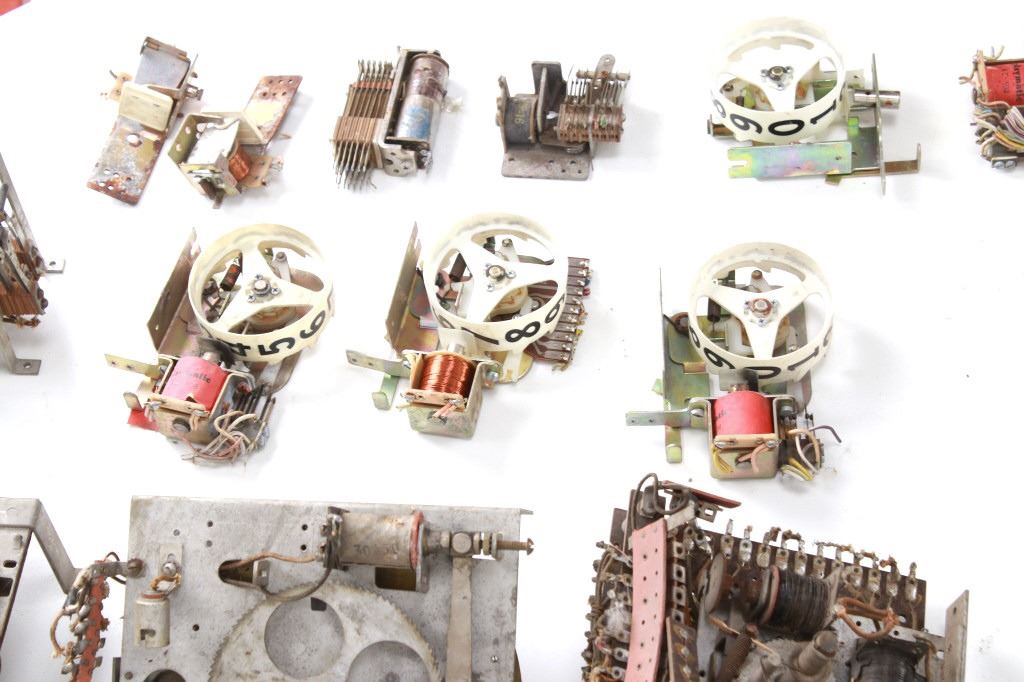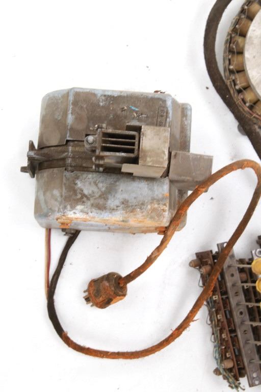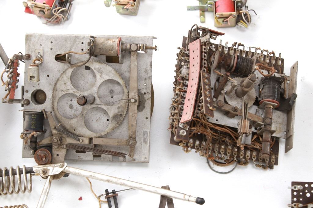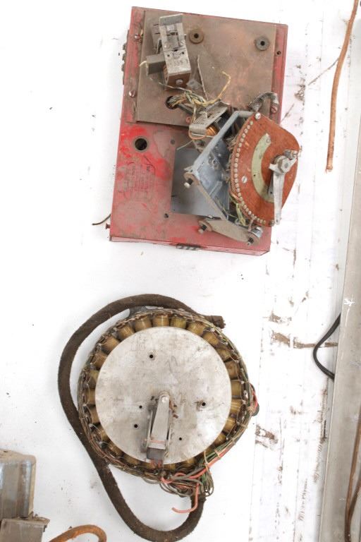 Featured in this lot is a large collection of over 150 used pinball machine parts from 1950-80s. Some of the machine parts include: Playmatic score reel coils with original score reels, Chicago Coin relay coils, Gottlieb relay coils, fuses, Chicago Coin scoring relay coils, Win relay shuffle switches, score motor unit, light sockets, circuit boards and much more. The parts come from various manufacturers of pinball machines such as: Chicago Coin, Gottlieb, Playmatic, Stern and Williams. Some parts come complete and some are missing components and/or relay coils. The largest part measures 24 1/2" L x 3 3/4" W x 6" H, while some of the smallest measure 1 1/8" L x 1" W x 1 1/4" H.