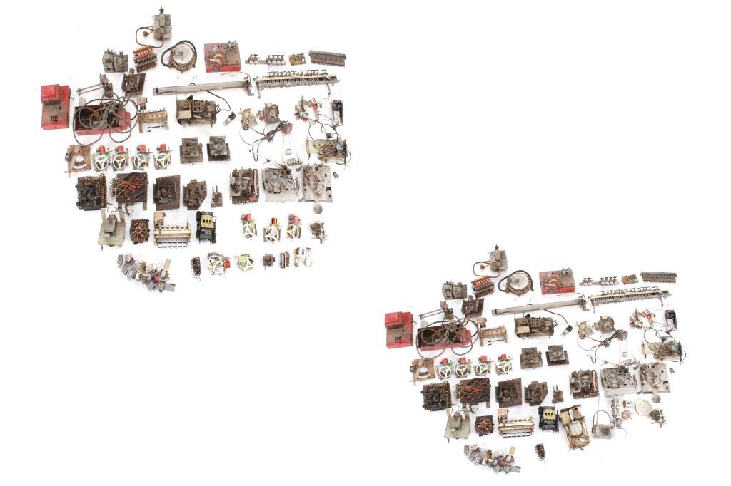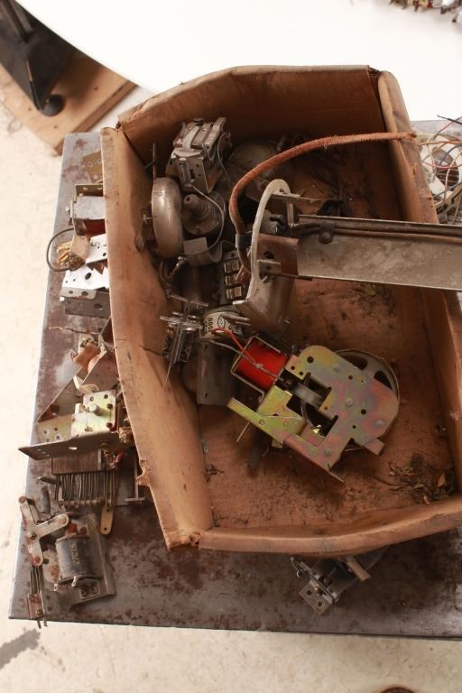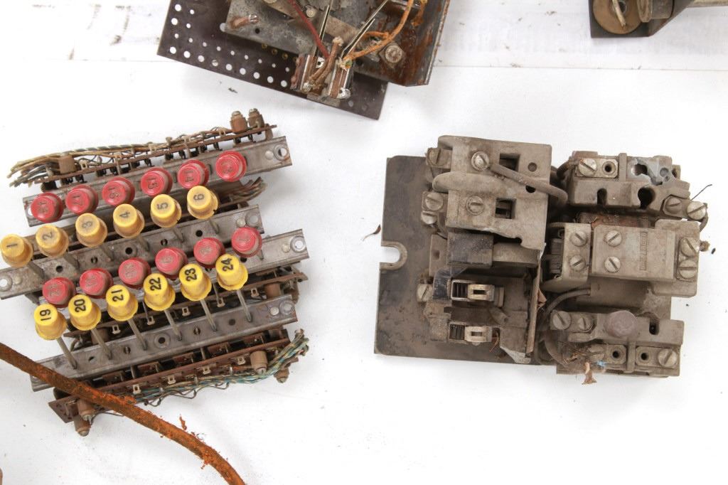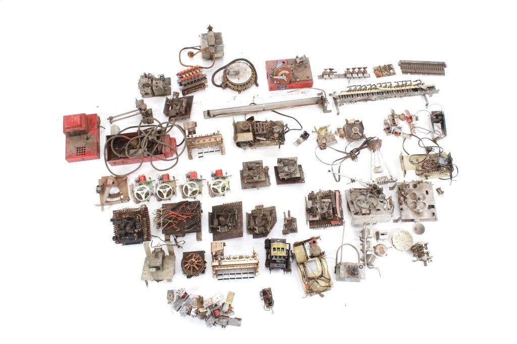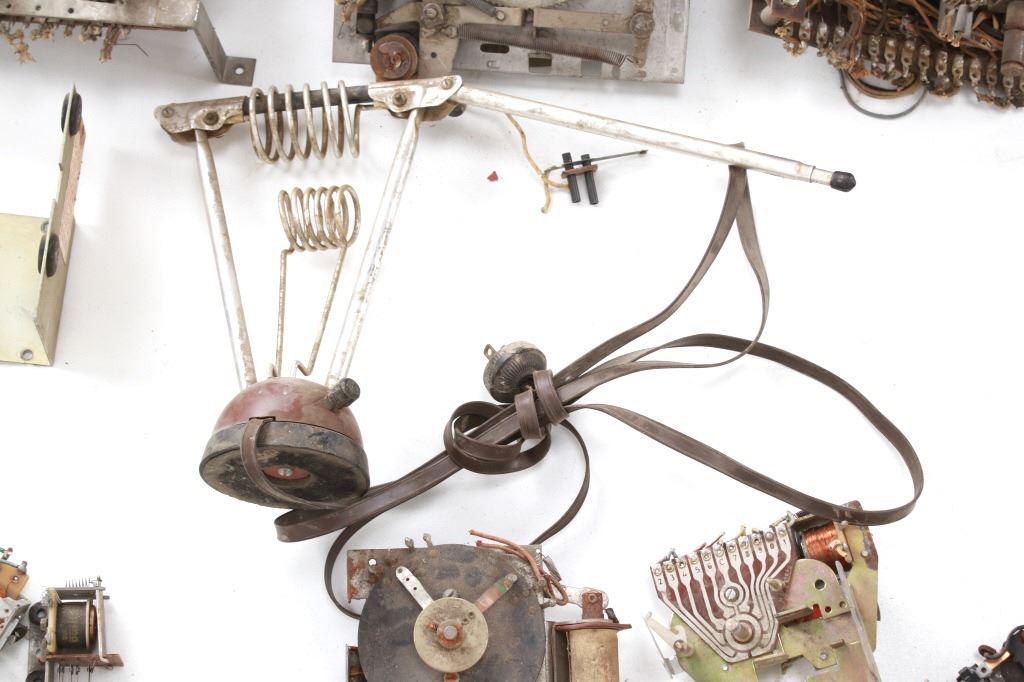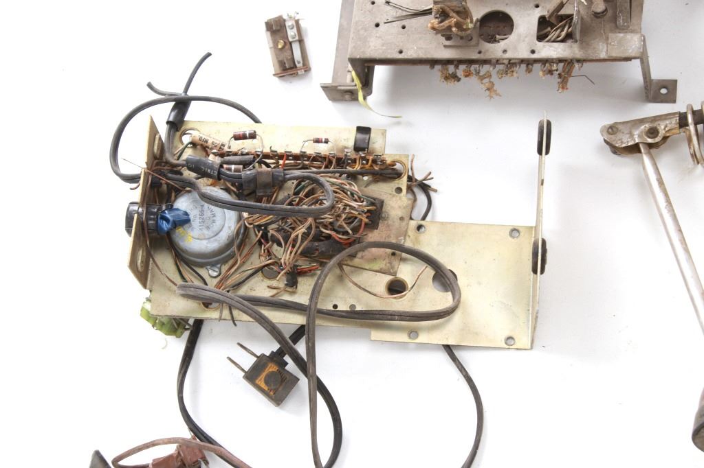 Featured in this lot is a large collection of over 150 used pinball machine parts from 1950-80s. Some of the machine parts include: Playmatic score reel coils with original score reels, Chicago Coin relay coils, Gottlieb relay coils, fuses, Chicago Coin scoring relay coils, Win relay shuffle switches, score motor unit, light sockets, circuit boards and much more. The parts come from various manufacturers of pinball machines such as: Chicago Coin, Gottlieb, Playmatic, Stern and Williams. Some parts come complete and some are missing components and/or relay coils. The largest part measures 24 1/2" L x 3 3/4" W x 6" H, while some of the smallest measure 1 1/8" L x 1" W x 1 1/4" H.