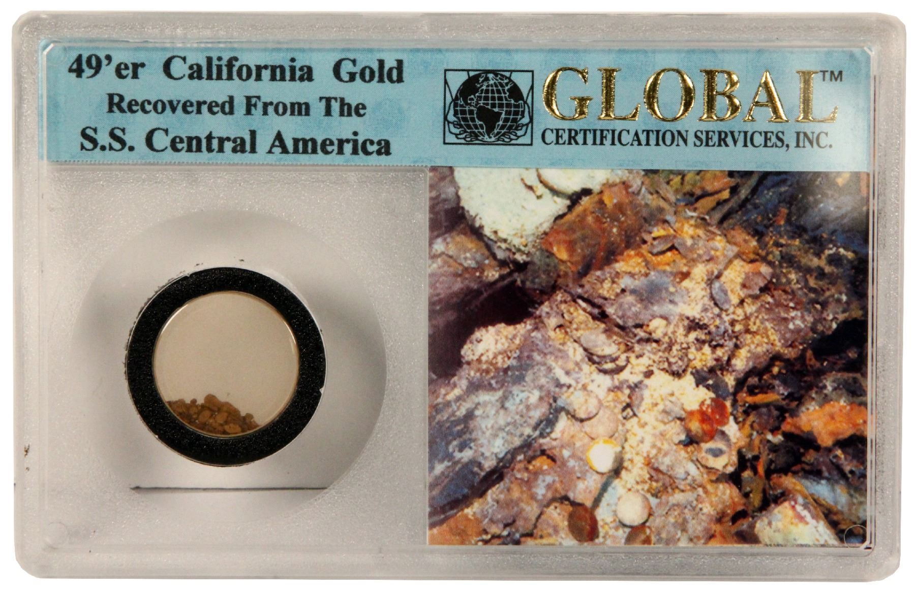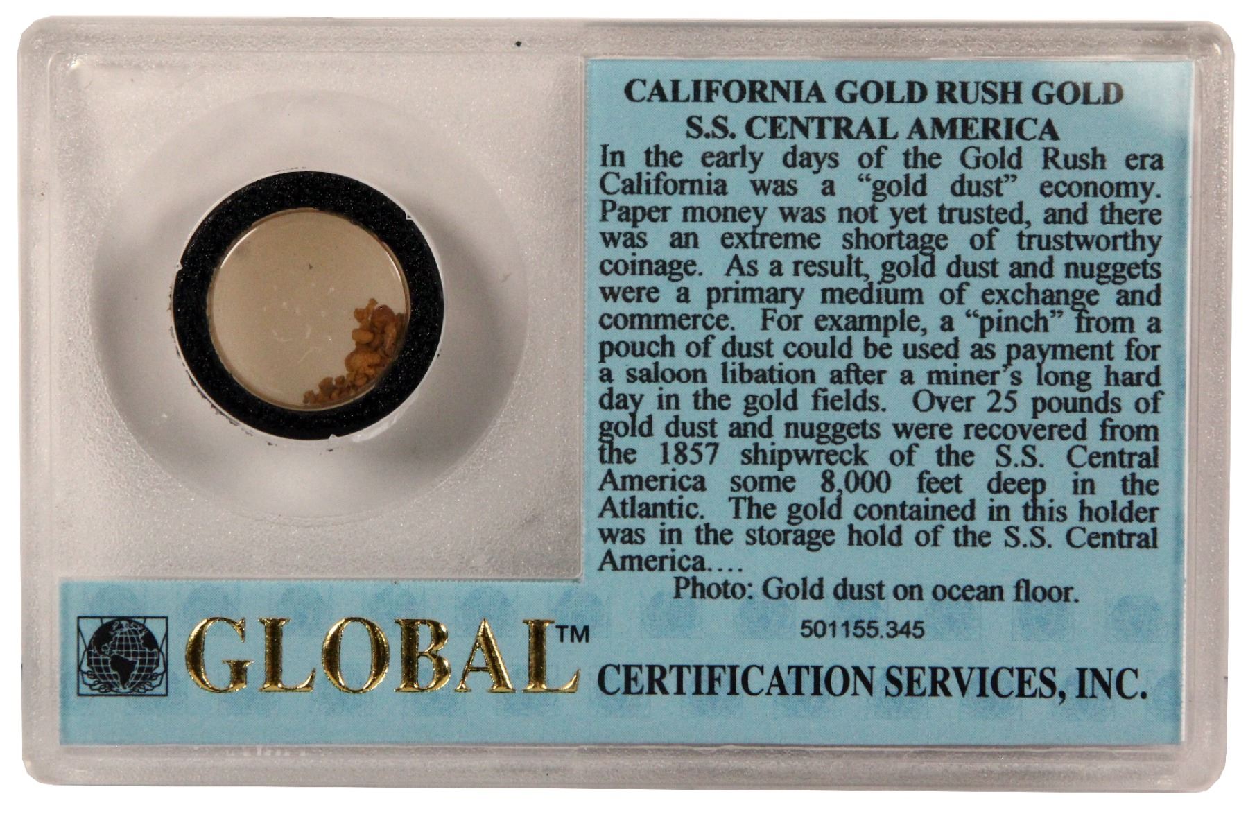 "Pinch" of gold nuggets and flakes in Global Certification Services capsule, ex-SS Central America (1857). 2-3/4" x 4-1/4" slab. Decent-sized small nuggets and some dust in a typical promotional capsule with printed card inside detailing the wreck and the California Gold Rush in general. From the SS Central America (1857).