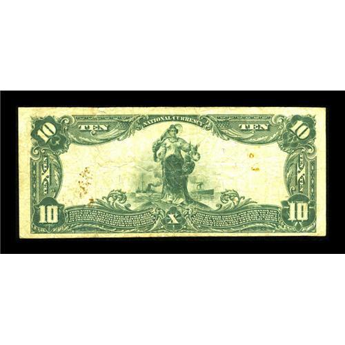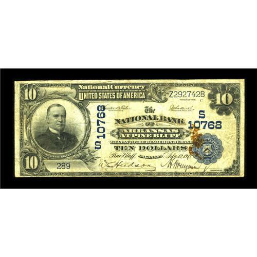 <B>Pine Bluff, AR</B></I> - $10 1902 Plain Back Fr. 632 <B>The NB of Arkansas at Pine Bluff</B></I> Ch. # (S)10768<BR>Other than one bank which is yet unreported, this is Pine Bluff's scarcest large issuer, with the census listing just six large examples not including this note. Our records show just two offerings of large notes from here since 1980, with one coming in a 1983 Hickman-Oakes auction and the other an appearance in one of our auctions in 1999. The pen signed signatures are of the cashier and vice president. The tombstone also displays an interesting layout that includes the state name. There is some staining, mostly near the Treasury Seal. <B>Fine.</B></I><BR><I>From The Jacob and Heather Dedman Collection</B></I><BR><BR><b>Shipping:</b> Coins & Currency (<a target="_blank" href="http://www.heritageauctions.com/common/shipping.php">view shipping information</a>)