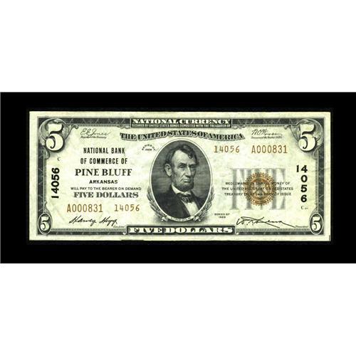 <B>Pine Bluff, AR</B></I> - $5 1929 Ty. 2 <B>NB of Commerce</B></I> Ch. # 14056<BR>This is one of the really tough 14000 charter banks to obtain, with our records showing no offerings of any kind from this bank in almost ten years. Bright <B>Very Fine,</B></I> certain to be a most sought after item.<BR><BR><b>Shipping:</b> Coin/Currency (<a target="_blank" href="http://www.heritageauctions.com/common/shipping.php">view shipping information</a>)
