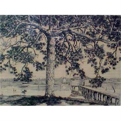 In the original AAA frame, artist signed in pencil and dated lower right. Eching with a title of Pine Branches . Image size 9 3/4 high inches X 12 7/8 inches Wide. Edition of 250. Artist signed lower right with date.<p>Alfred Heber Hutty and Louis Kronberg were Locke's mentors. He was a Florida based artist but did work else-where in the country. This work was done in 1939. Slight toneing not taken out of frame