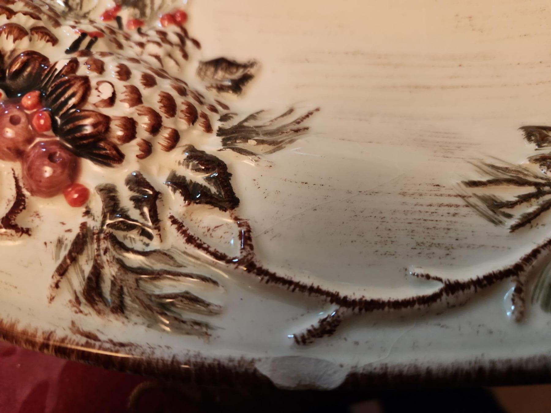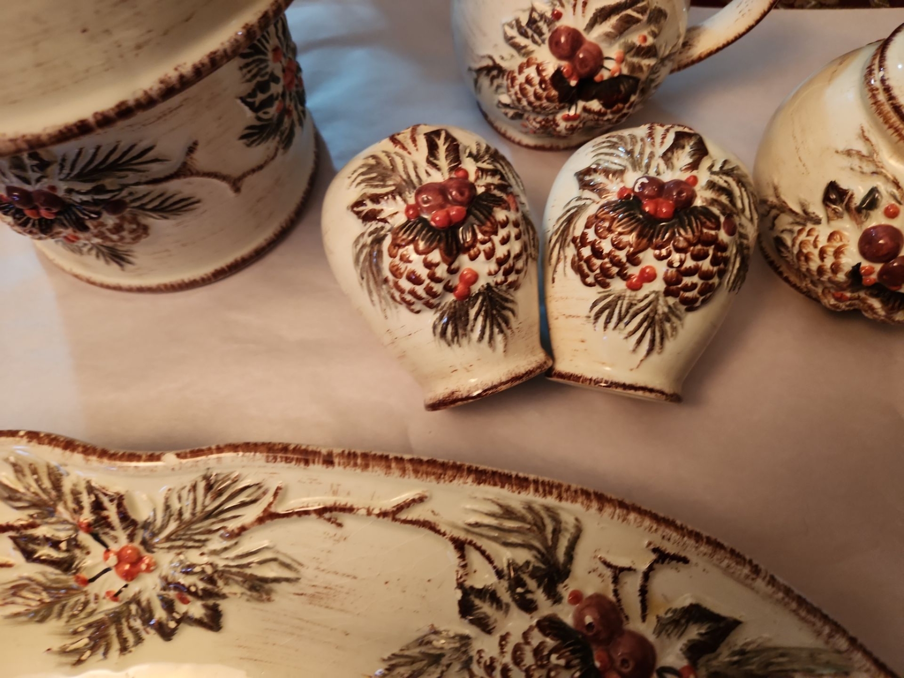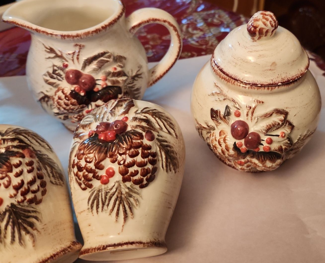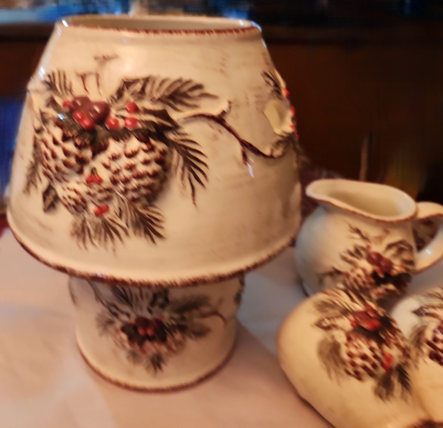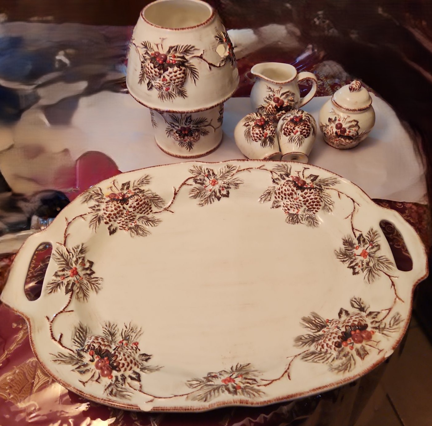 Pine Cone Pattern Set Includes: Serving Tray 20 L, 14 W, Cream/ Sugar, Salt/ Pepper, Candle Lamp 9 T