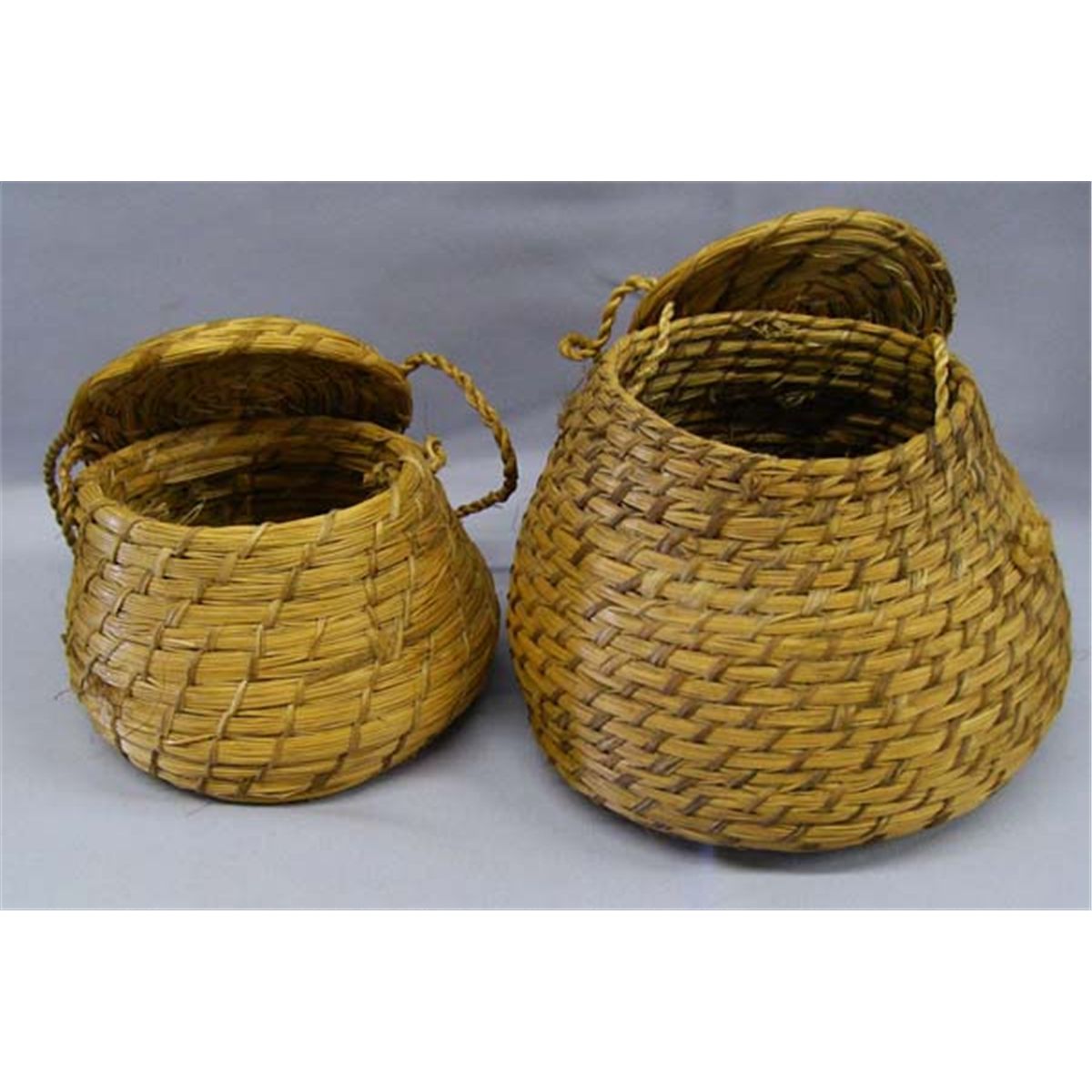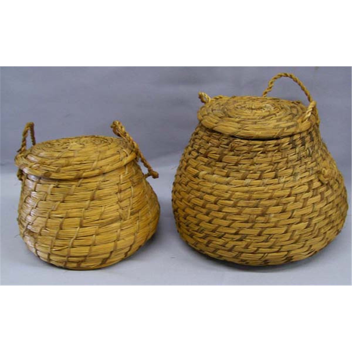 Pine Needle Baskets w/Lids/2. The lids are attached to the baskets by a natural fiber twisted cord. Origin is unknown, possible Southeastern US. Largest basket measures approx. 6'' x 5'', the smaller 4'' x 3.5''. Buyers Pay Actual Shipping and Handling Charges(see terms and conditions for more information).