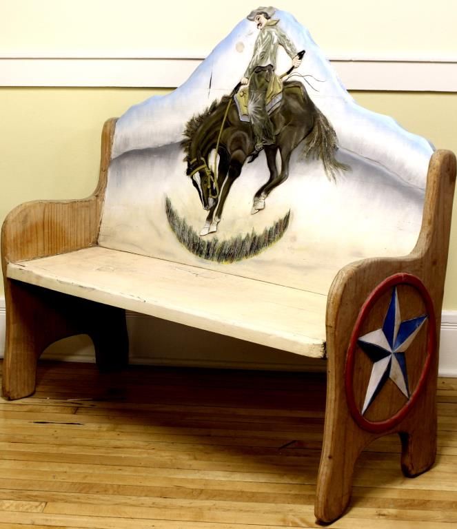 Pine carved cowboy bench, back with bucking horse cowboy, 45" long.