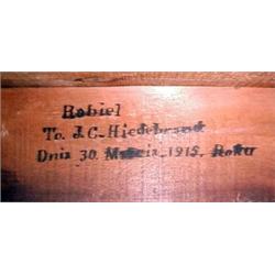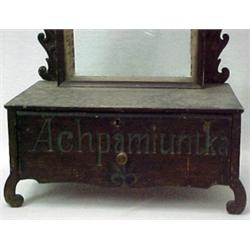 Pine display cabinet, Imperial eagle crest over glazed shadowbox with carved side trim, on attached rectangular top over one drawer, "Achpamiuntka" inscribed on drawer front, C scroll feet, signed inside cabinet and dated 1915, measures 37" high x 17" across x 10 1/2" deep Estimate 160/300