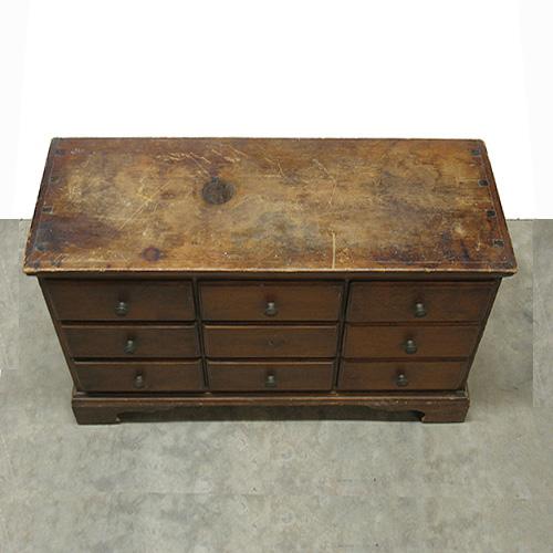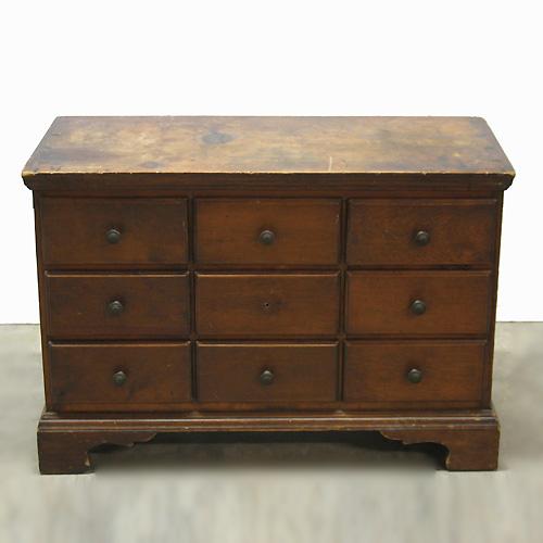 Pine nine drawer chest; dovetailed construction; bracket feet; mid to late 19th C.; 24 3/4" high x 35 3/4" across x 11 1/2" deep (wear to finish)