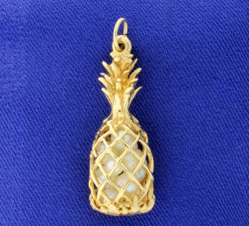 This unique pendant is 14K yellow gold and has a great design! It has several pearls inside varying in size. 6.6g