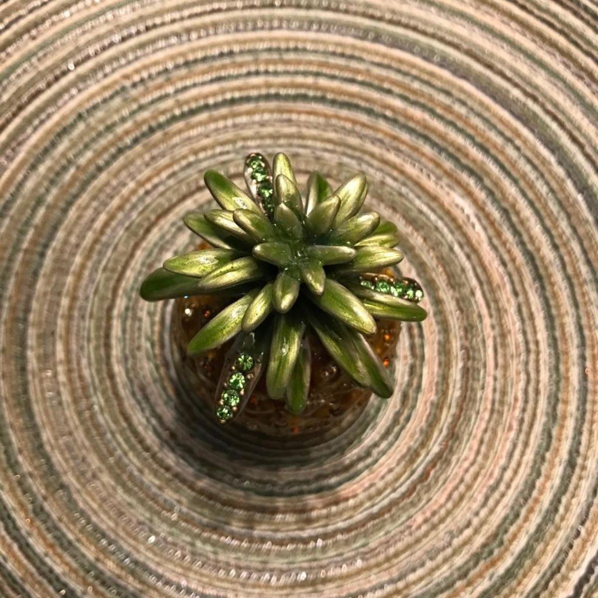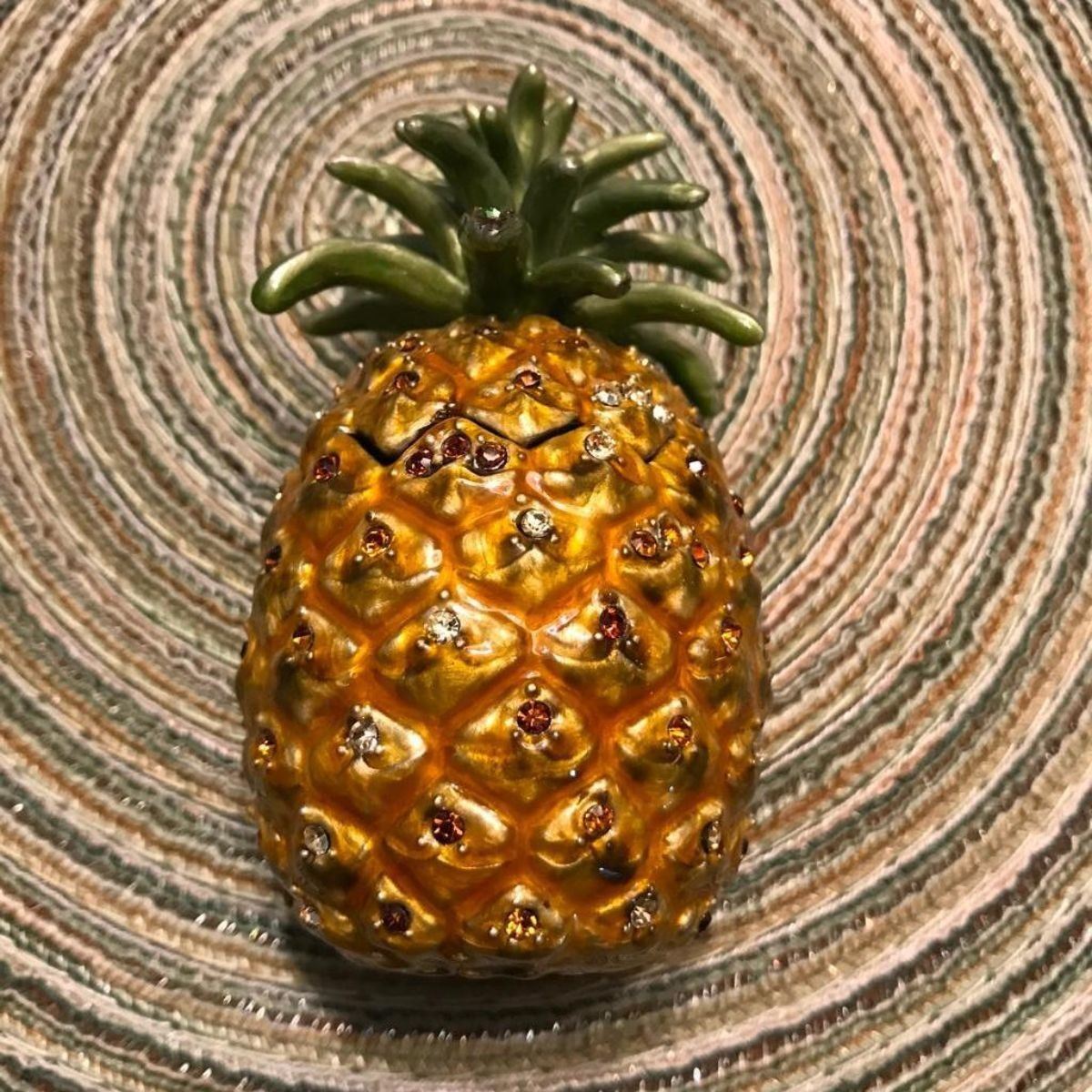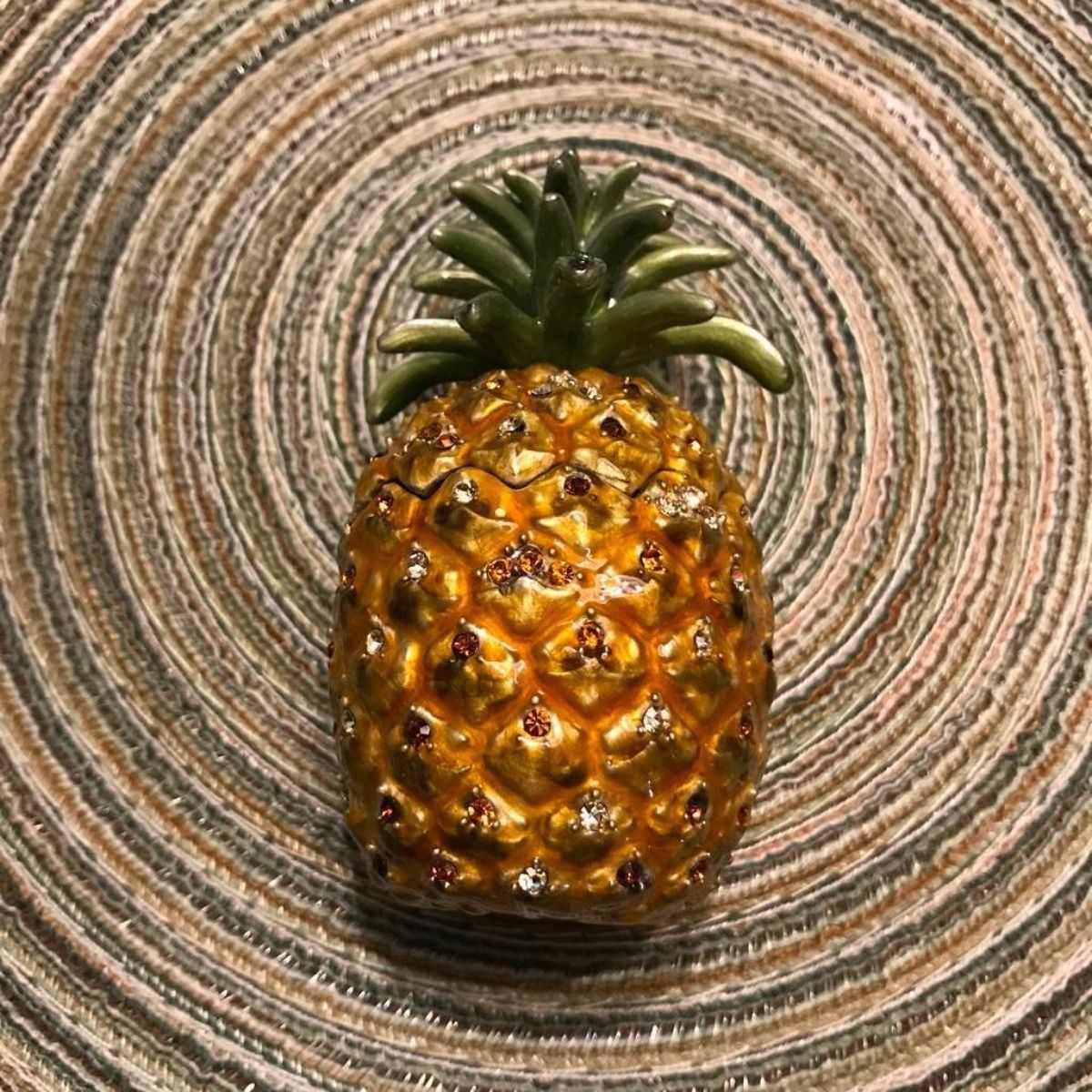 Pineapple trinket jewel box. Enamel over pewter with embedded Austrian crystals. The top lifts off to reveal a hidden enameled interior trinket jewel box with magnetic closure. 3 1/2" H X 1 3/4" W.Â