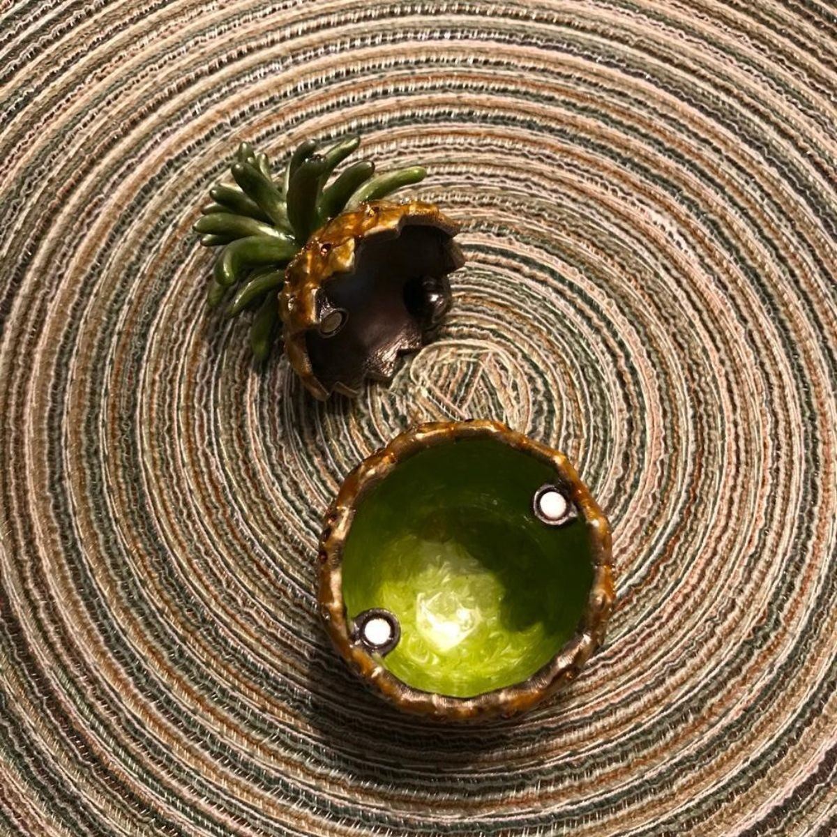 Pineapple trinket jewel box. Enamel over pewter with embedded Austrian crystals. The top lifts off to reveal a hidden enameled interior trinket jewel box with magnetic closure. 3 1/2" H X 1 3/4" W.Â