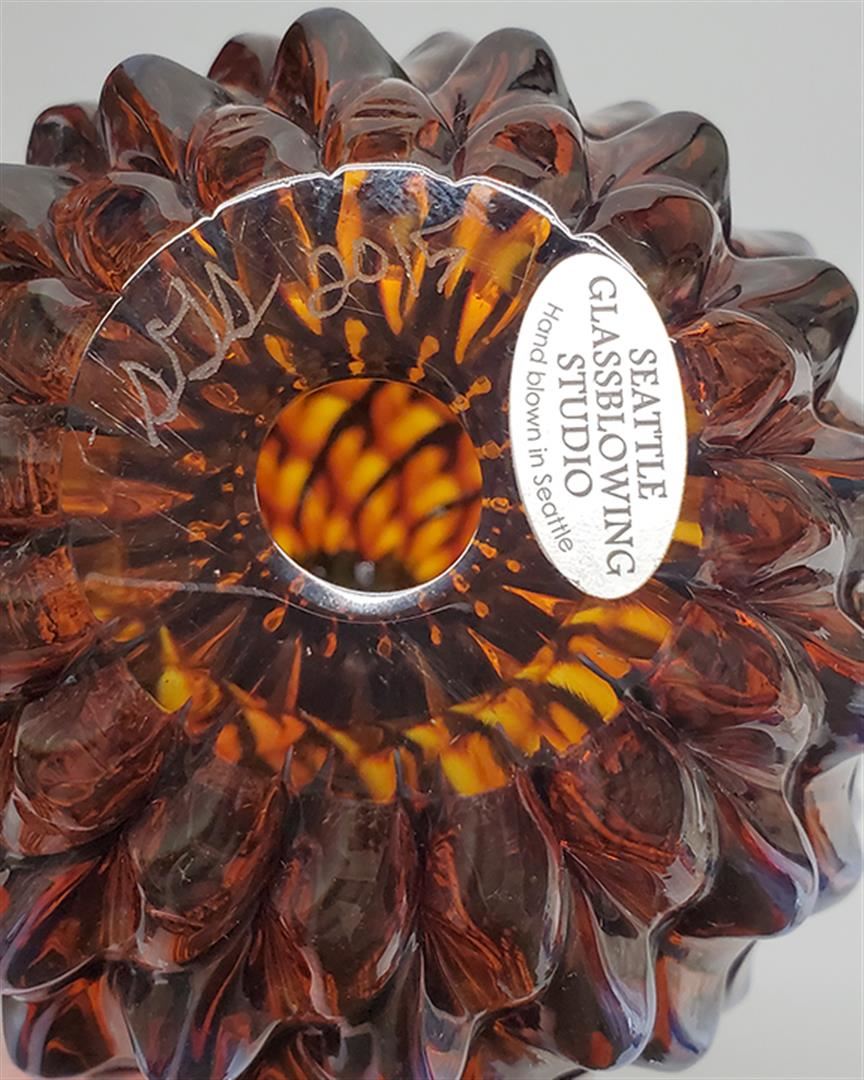 Amber and green pineapple sculpture signed in 2015, this piece measures 12.5" tall and 5" diameter.