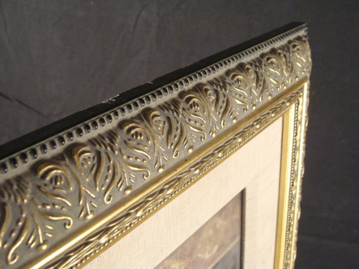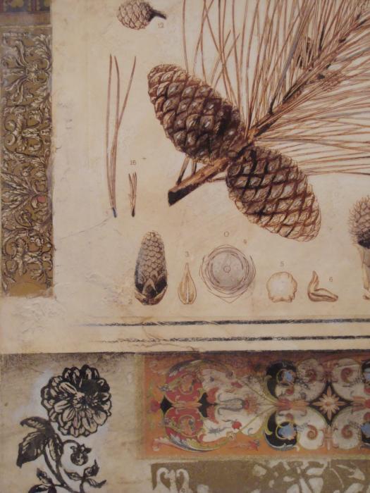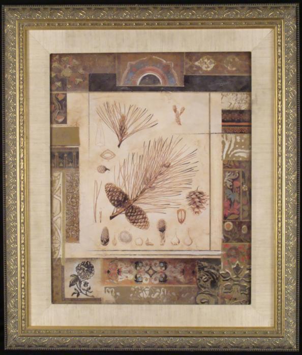 This print portrays a group of pinecones, inspired by sketches from natural history books, bordered by attractive decorative designs. < p>Medium: Lithograph on paper Image size: 15 1/2 x 19 1/2 inches Framing: Matted in natural tone fabric matte, with decorative wood frame with gold coloringFrame size: 23 x 27 inchesCondition: Excellent; some suffs to the top edge of frame, but not very noticableBring the comfort of nature and fine design to your home or office with this nice print.