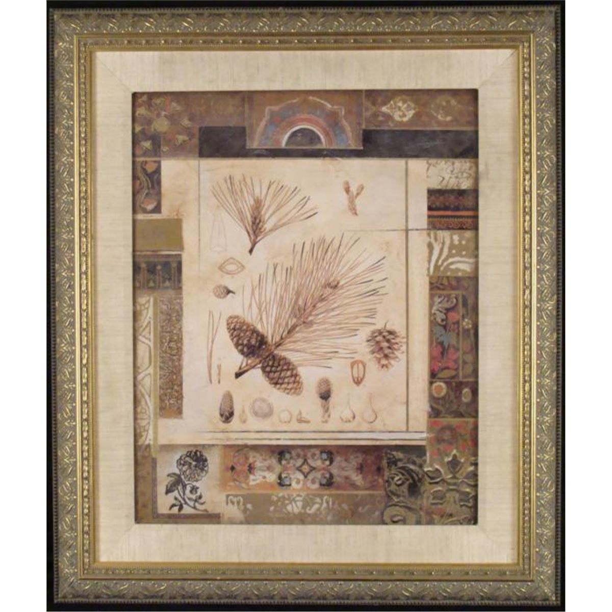 This print portrays a group of pinecones, inspired by sketches from natural history books, bordered by attractive decorative designs. < p> * Medium: Lithograph on paper Image size: 15 1/2 x 19 1/2 inches Framing: Matted in natural tone fabric matte, with decorative wood frame with gold coloringFrame size: 23 x 27 inchesCondition: Excellent; some suffs to the top edge of frame, but not very noticableBring the comfort of nature and fine design to your home or office with this nice print. * *