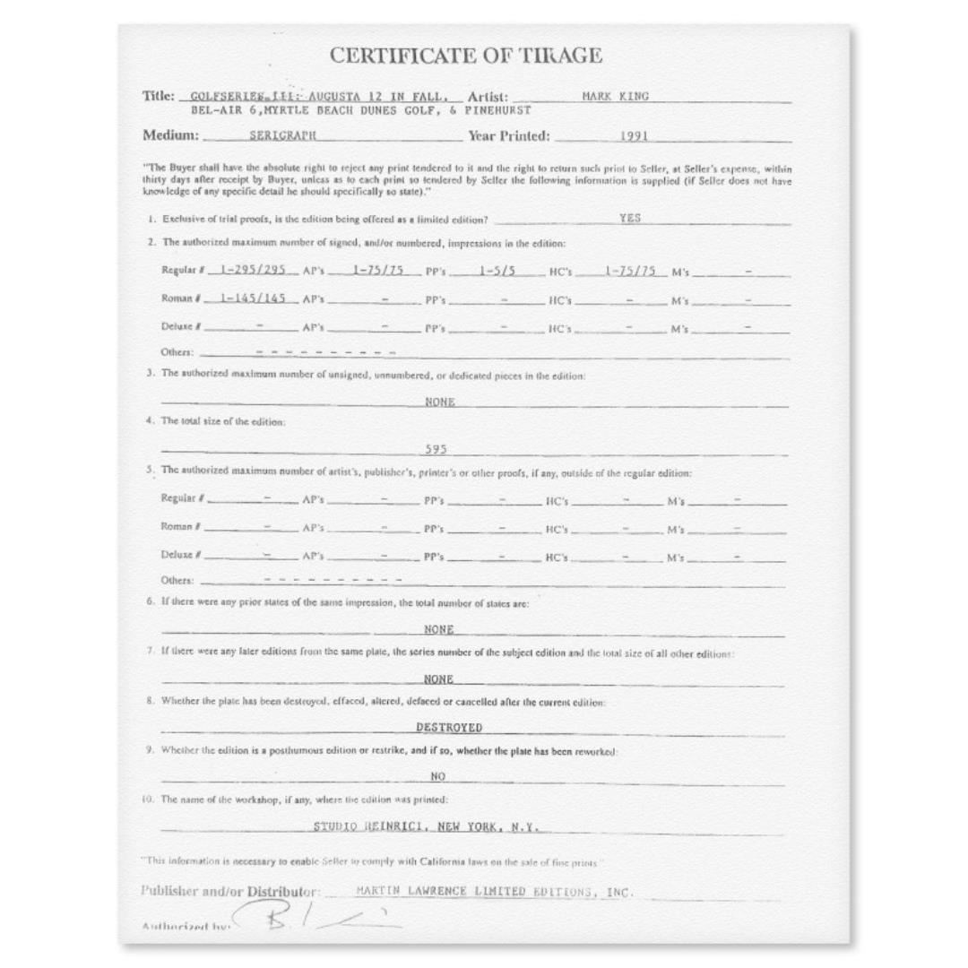 "Pinehurst II (4 Up Golf)" is a limited edition serigraph on paper by Mark King (1931-2014). Hand signed and numbered, this piece comes with a letter of authenticity and measures approximately 15" x 20" (image).