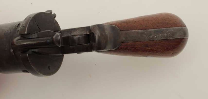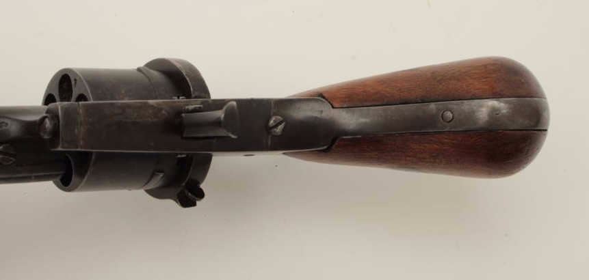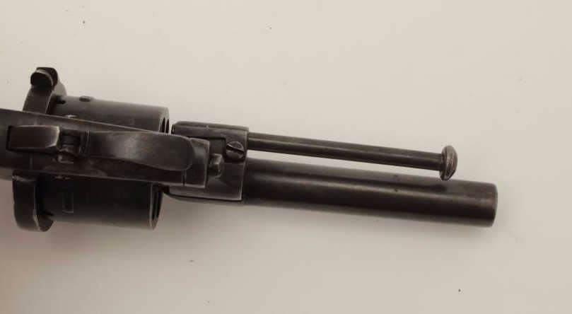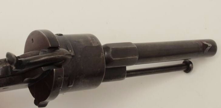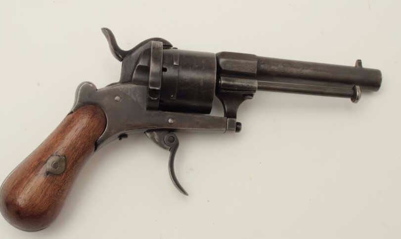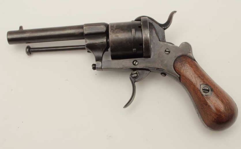 Pinfire revolver in original pipe case, 7.65mm caliber, 3.5” barrel, wood grip, action needs adjustment; pipe case is overall good to very good. (Antique). Est.: $400-$800.